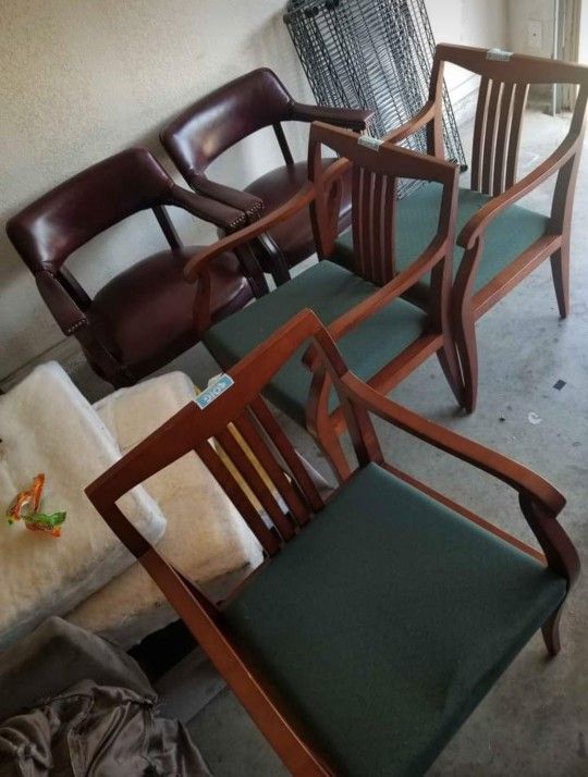 HABLO ESPAÑOL 5 office/guest/lounge chairs in perfect like new condition with solid wood frame and comfy green cushions.