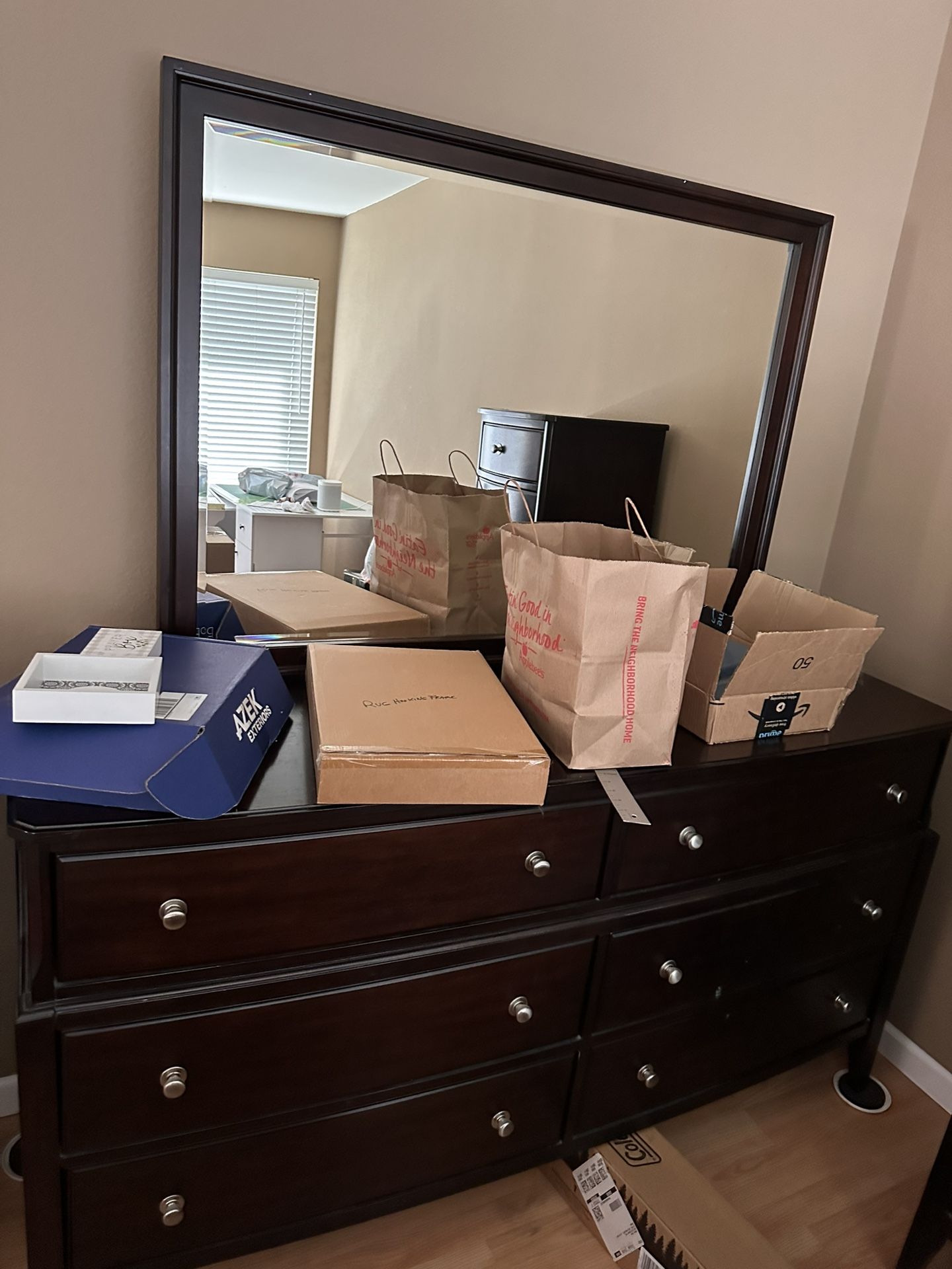 Four pieces: dresser, mirror, night stand, drawers. Nice shape overall.