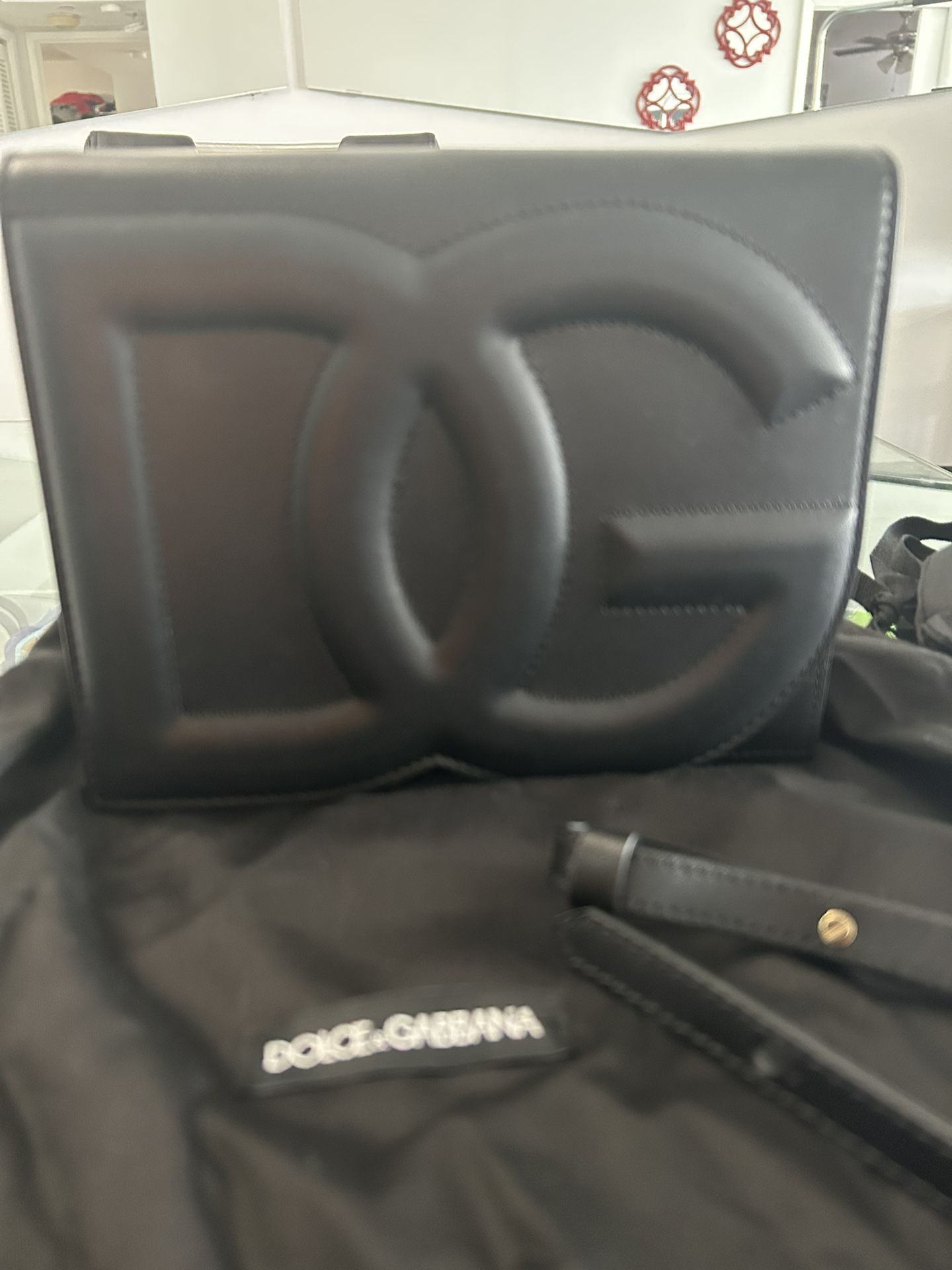 Stylish black bag with bold DG embossing. Perfect for modern elegance.