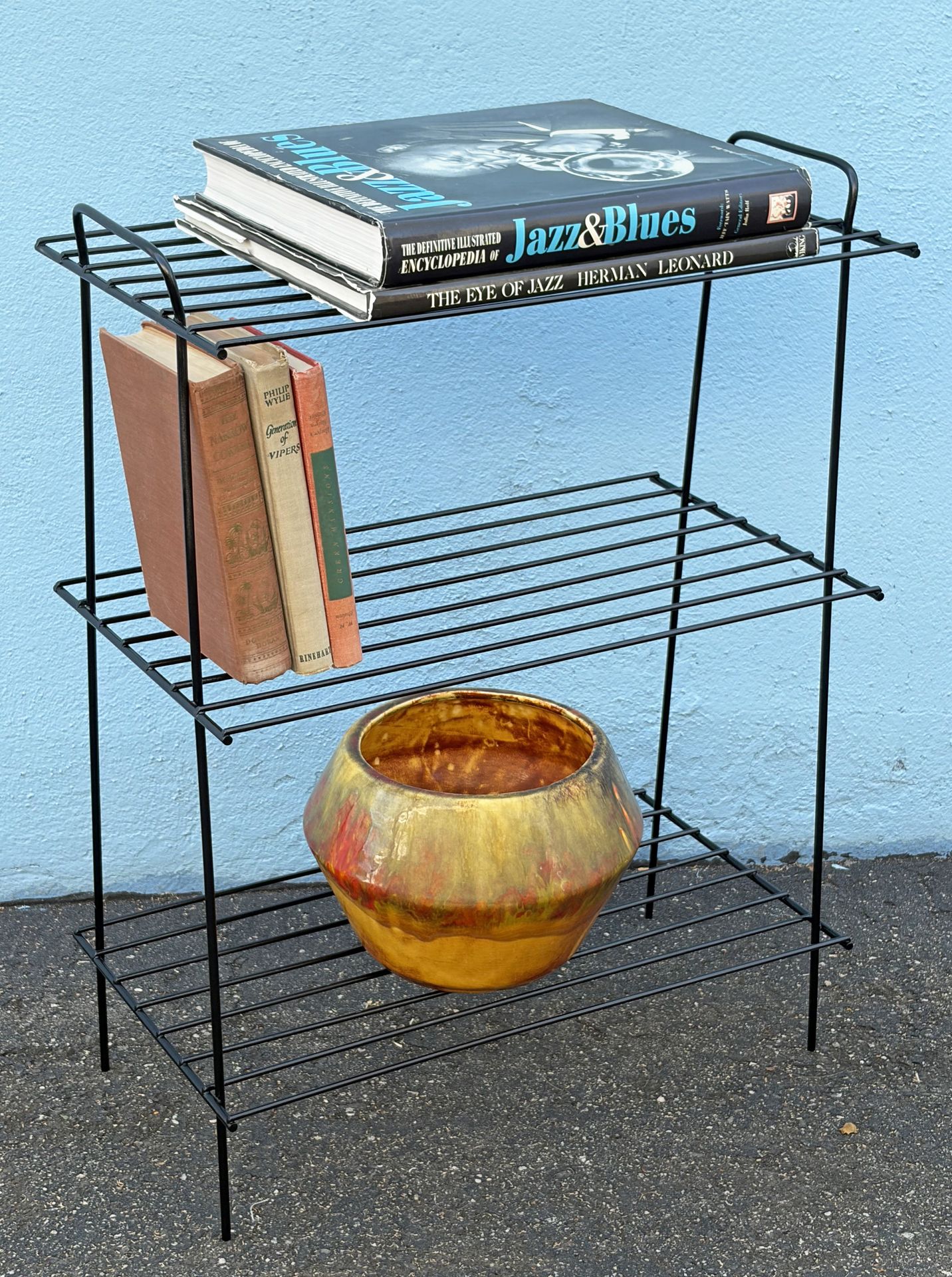 Mid century wire bookshelf/plant stand. 11"x20"x26.5" tall. Shelves are 9.5" and 10.75" apart. Semi-gloss black finish. No rust. Clean and simple.