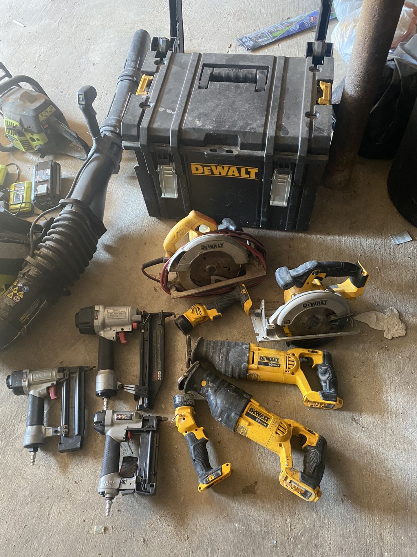 READ!! Dewalt set willing to sell all together or separate box included (does not come with any batteries) Ryobi electric blower comes with 2 40v batteries and chargers (works great) Gas powered ryobi blower works but doesn’t have the pull string to start. Chain saw was working when last used just needs a part. Send me offers or questions about pricing Serious inquiries only.