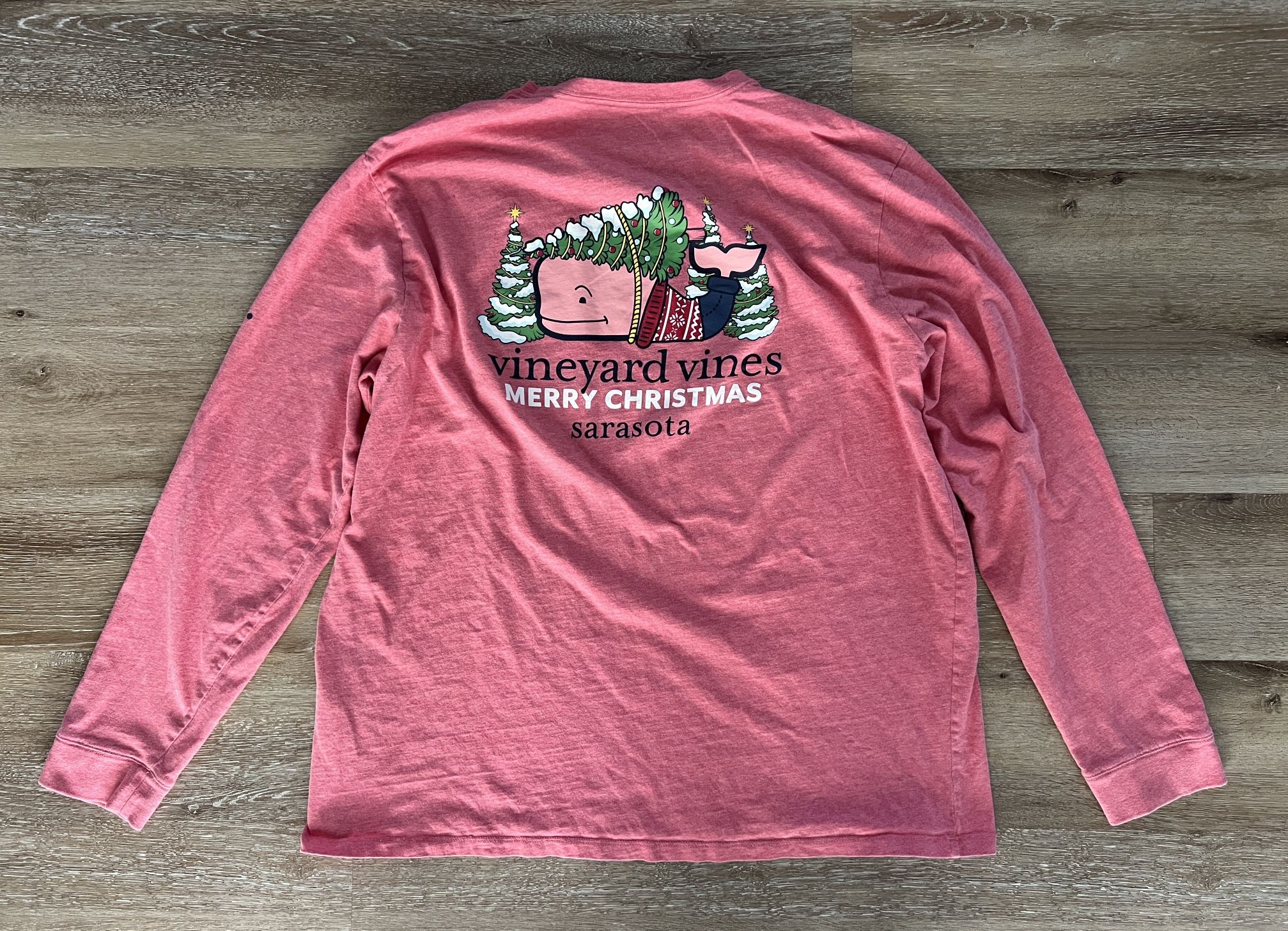 VINEYARD VINES Long Sleeve T-Shirt PINK Christmas Sarasota Men’s Size XL Has markings on the sleeve See photos for measurements and flaws