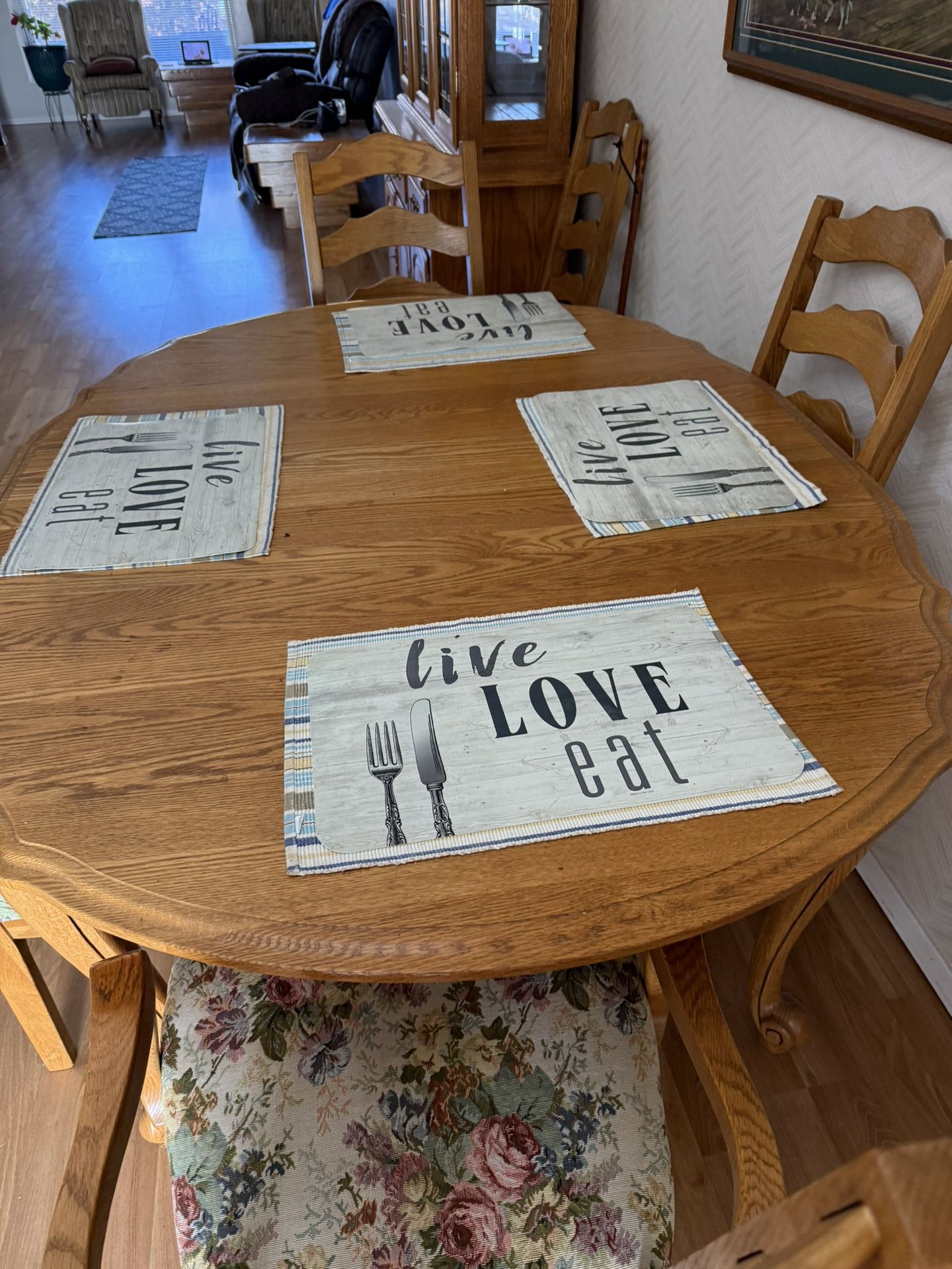 Classic oak dining set with matching china cabinet. Table has a center slat and comes with 8 chairs, seats have pretty floral pattern upholstery. China cabinet has glass doors on top, solid wood on bottom, but left side glass is broken. Still a great set for a dining room.