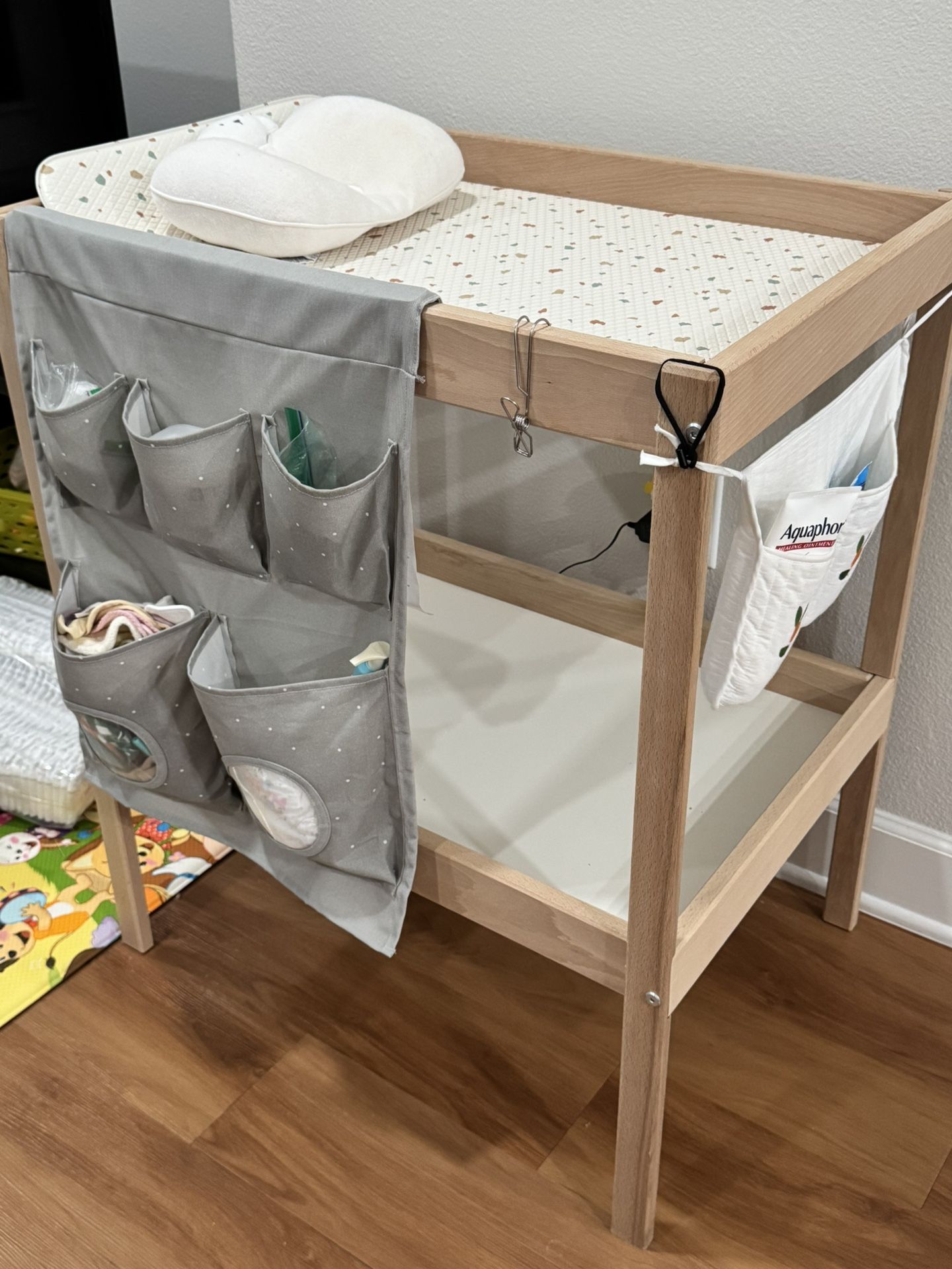 The table was never used for diaper changes involving urine or bowel movements, so it has been kept clean and in very good condition. Includes: • Gray hanging storage organizer (side-mounted) • Silicone changing pad