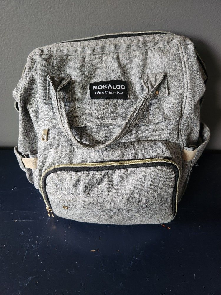 Gray Mokaloo diaper bag. Has plenty of storage space and pockets. Great for on the go activities.