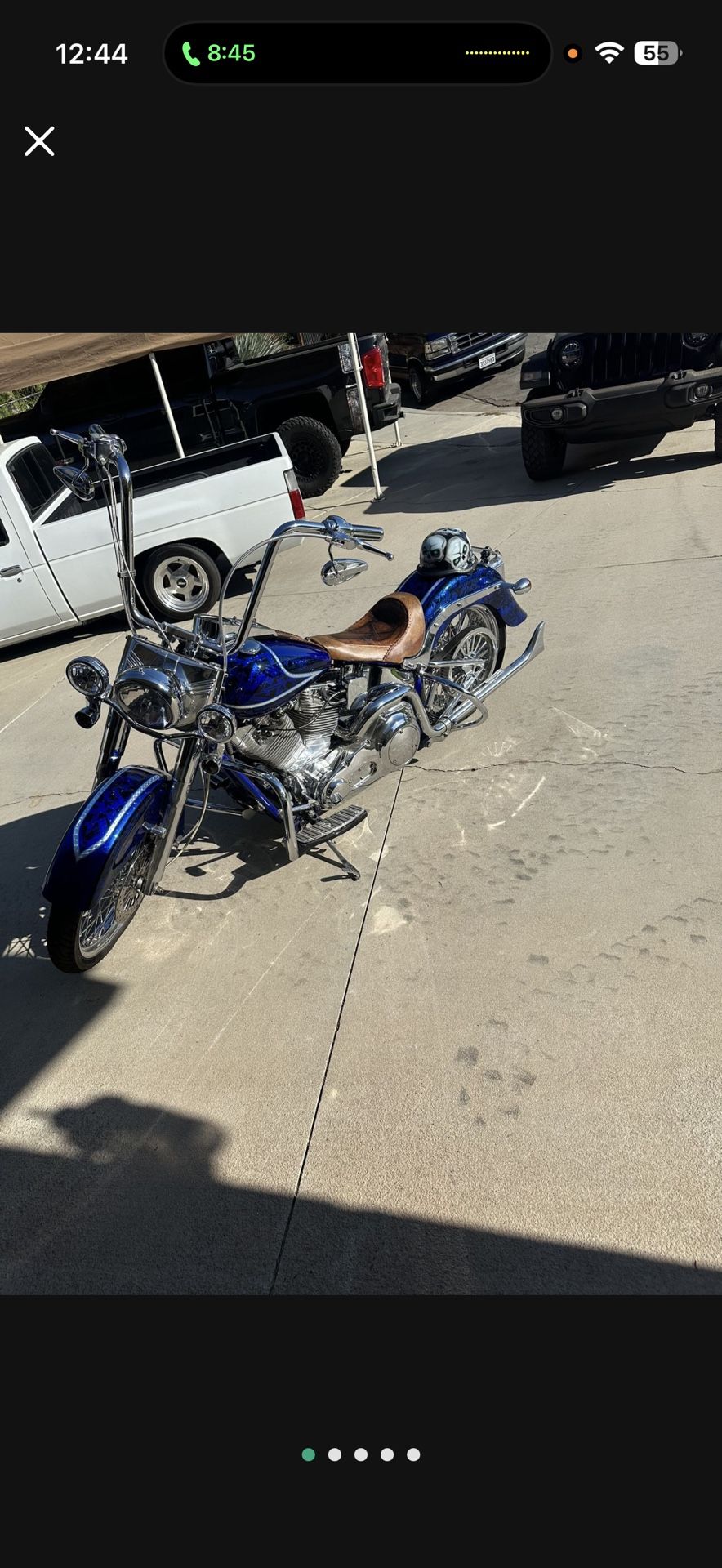 Painted by Bootleg, custom Candy Blue metal flake with scallops and custom graphics is beautifully unique. Craftech custom frame and a chrome console. Chrome 18" apes, braided lines, and chrome / rubber grips. Chrome levers, custom tear drop type mirrors, brake reservoir, blinkers, and completely chrome H-D front end sitting on a chrome laced 21" rim. Chrome engine and rear guards. Dual 2:2 chrome exhaust with fishtails. A 110ci Ultima polished motor, Ultima polished 6 speed trans, and a Mikuni carburetor. Chrome circular air cleaner, cam, primary and derby cover. Chrome oil tank, coil cover, trans cover, and more. Custom hand tooled brown solo seat and tank strap by Danny Gray is unique as well. Rider floorboards and H-D brake pedal that matches grips. Chrome swing arm and a gorgeous chrome spoke style drive sprocket. 18" chrome laced rear rim with both tires looking almost new. Flared fender and tombstone type tailight. Fast, unique, and reliable.
