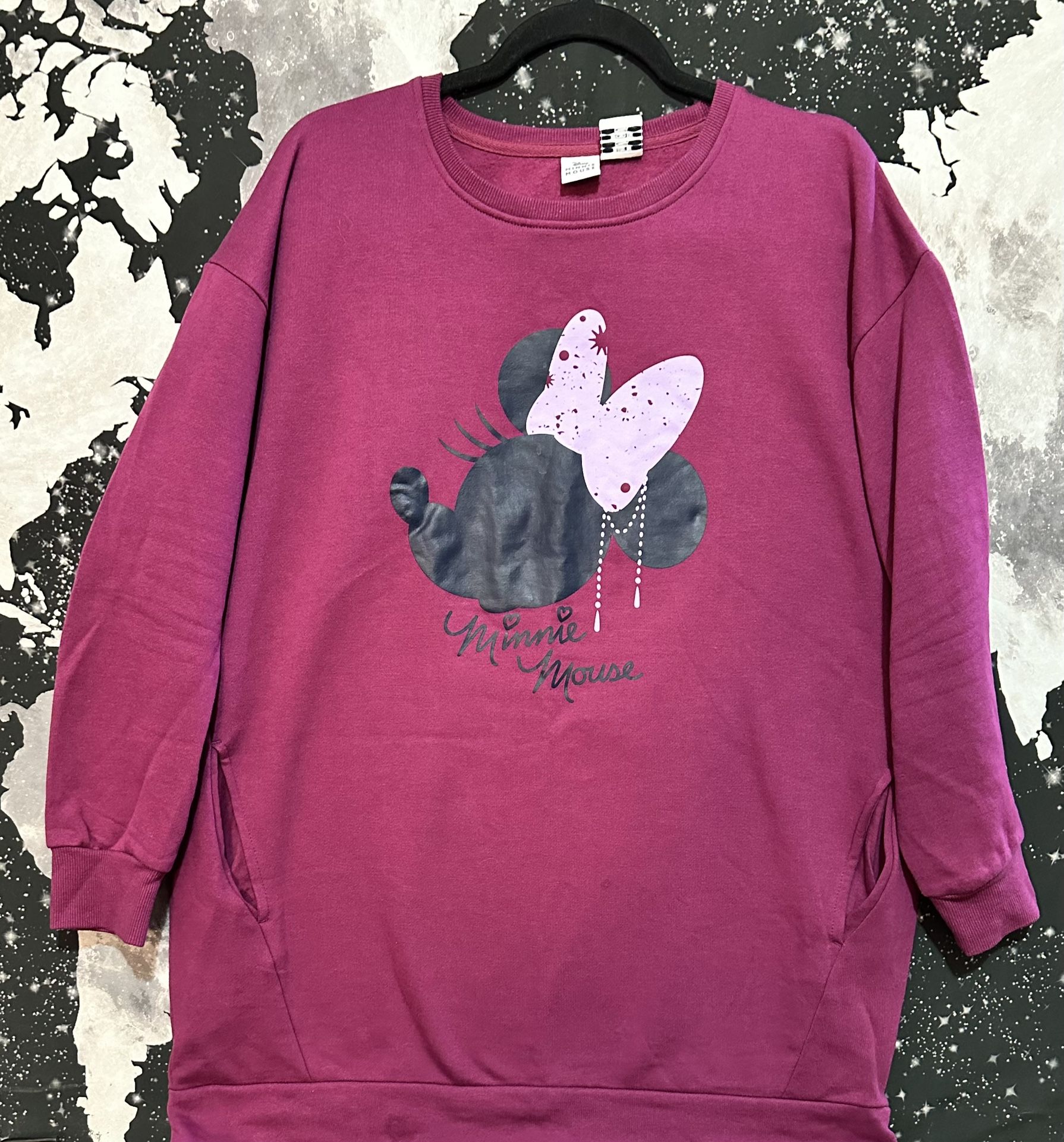 Disney Minnie Mouse cartoon character hair bow silhouette design oversized thigh-length long sweatshirt, color is maroon with front graphic & side pockets. Preowned condition *light discoloration marks towards front & bottom hem* Sz. Large 12/14 Measurements (25”x33” / Sleeve 19”)
