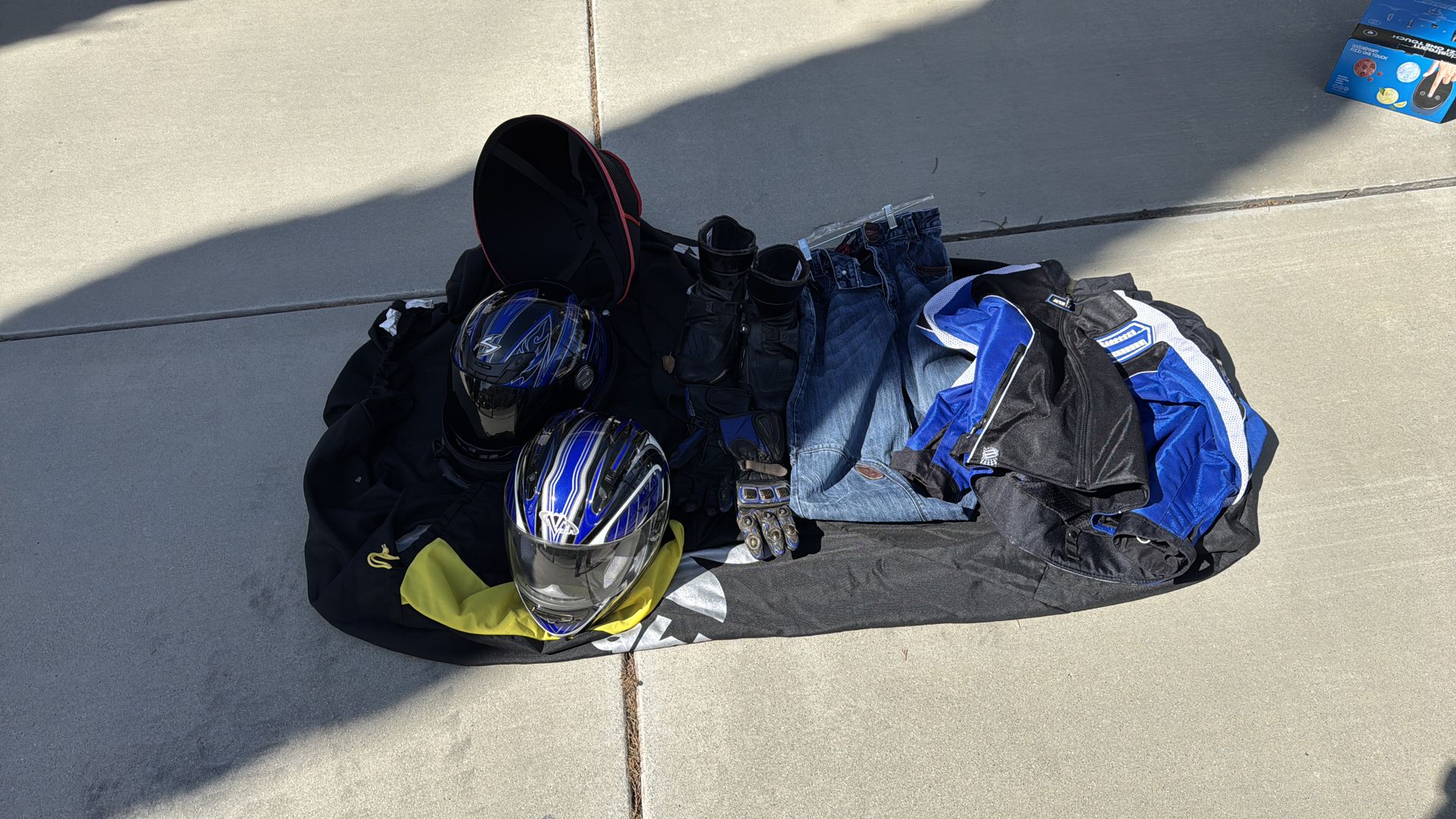 2 helmets with cases, gloves, shoes size 10, pants size 34, and Kawasaki.