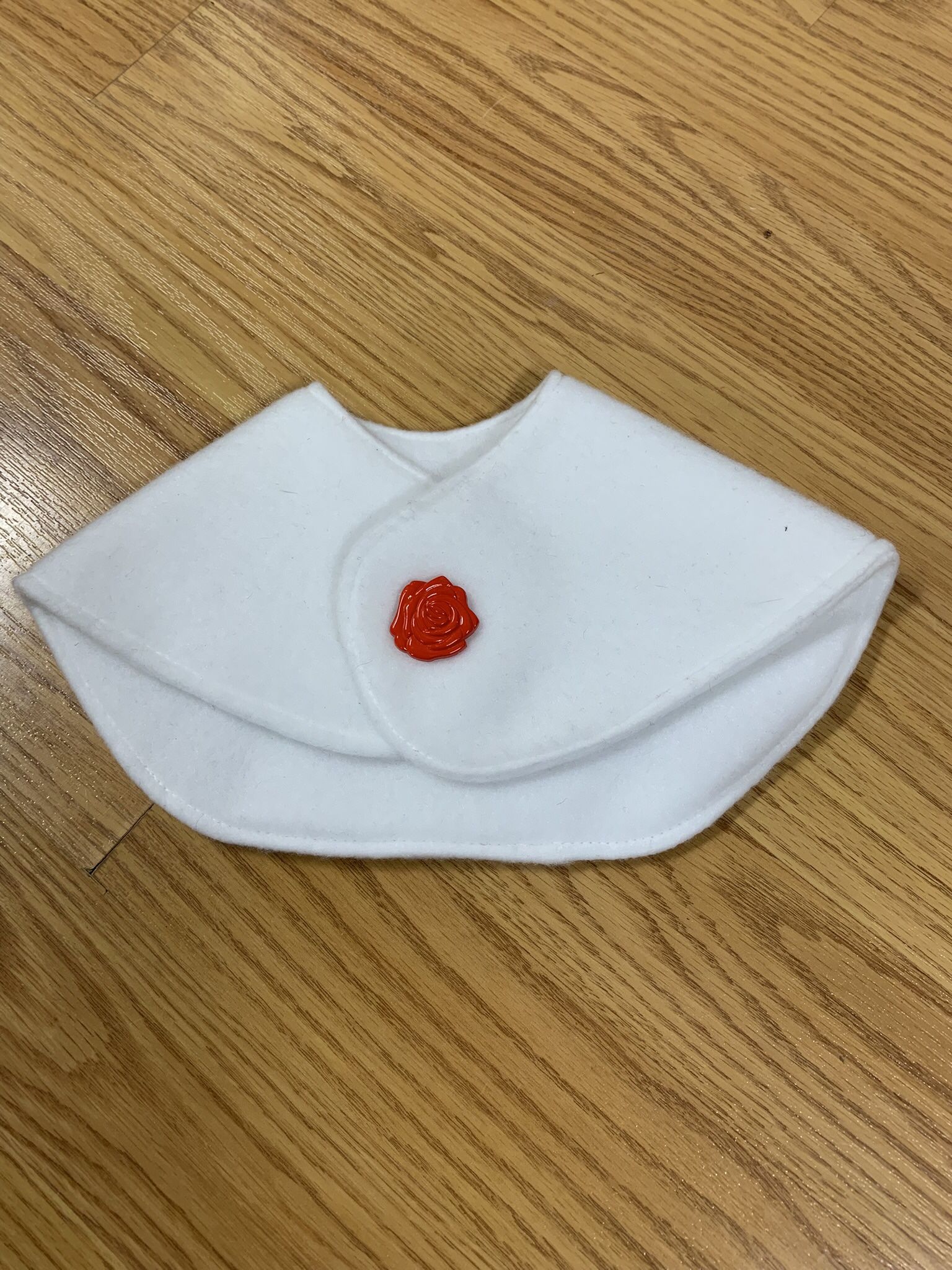 Small White Dog Shrug. Made of soft white material, with a red button closure. In a size small. 10” girth, 5” in length If you find several items on my page, which I am adding daily, I can give you an added discount. I am available to meet Monday, Tuesday, Thursday, and Friday. I can meet you in Marysville and the surrounding areas. Item is new, from a pet free and non-smoking home.