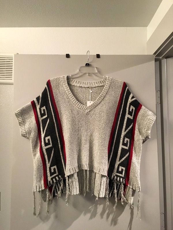 Soft aztec sweater poncho with fringe details in the front. This measure 30" wide, 23" in the front (not including the fringe) and 25.5 in the back. One size