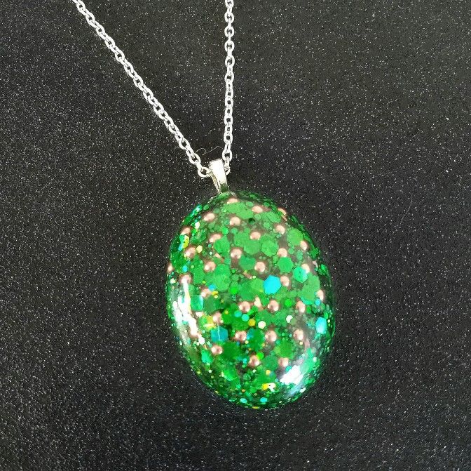 Green iron and copper organite orgone necklace. 20" inches long. NEW. Made with resin, green glitter, real iron shavings, and real copper bb's. Orgonite can help eliminate EMFs (electromagnetic frequencies), improve health, relieve stress, assist with a good night's sleep, clear negative energy and is great for meditation. #copper #orgonite #pendants #necklaces #handmade