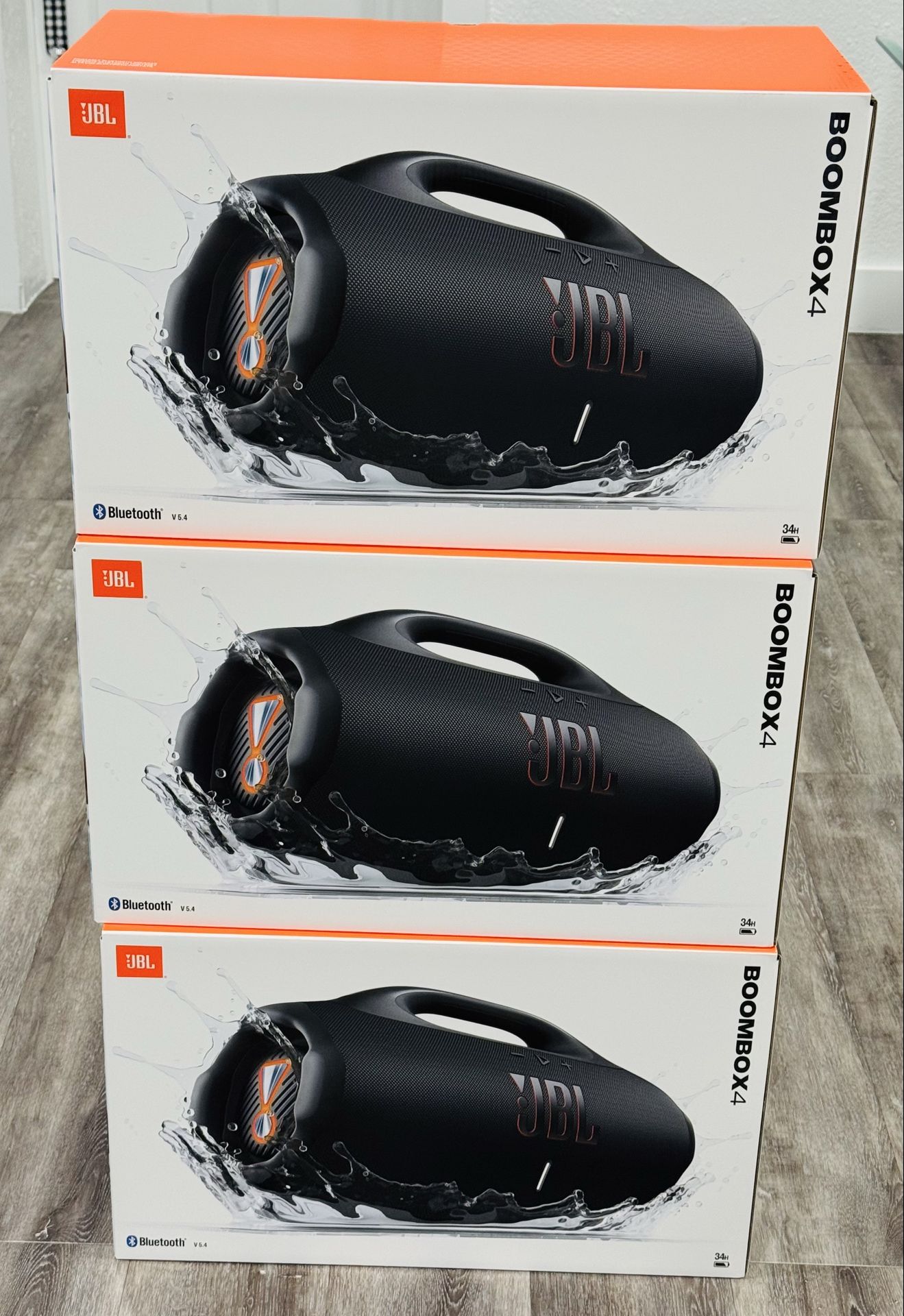 New JBL Boombox 4 portable speaker in black. This waterproof and dustproof speaker has up to 28 hours of playtime plus a 6-hour boost. It includes a built-in powerbank and two-setting bass boost with LED lights. Bluetooth version 5.4 is supported.