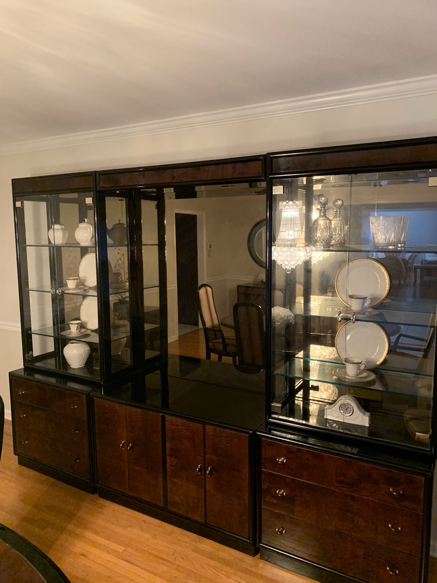3 section display cabinet. 2 sections have shelves and glass doors and the middle section is mirrored. Plenty of bottom drawers and cabinets for storage. 6' 8" h x 9' 1" w x 1' 6" d