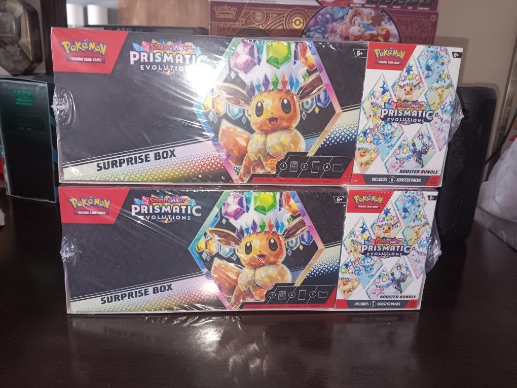 These are 2 pack Pokémon Prismatic Surprise Box + Booster Bundle I have 2 available .. each 2pack comes with a surprise box and booster bundle. 1 for $120 or both for $220 I have other items on my page also and if you have any questions please feel free to message me. First come first serve. Product details: Cards vary by pack; packs may vary by product Eevee and its Evolutions all have unique strengths to discover—and they get even more powerful when they appear as Pokémon ex! Eevee and its Evolutions all have unique strengths to discover—and they get even more powerful when they appear as Pokémon ex! In this collection, you get one randomly selected foil promo card featuring Eevee or one of its Evolutions as a Stellar Tera Pokémon ex, plus 10 booster packs from the special Scarlet & Violet. Prismatic Evolutions expansion. Then use the included dividers to organize and store your new cards!