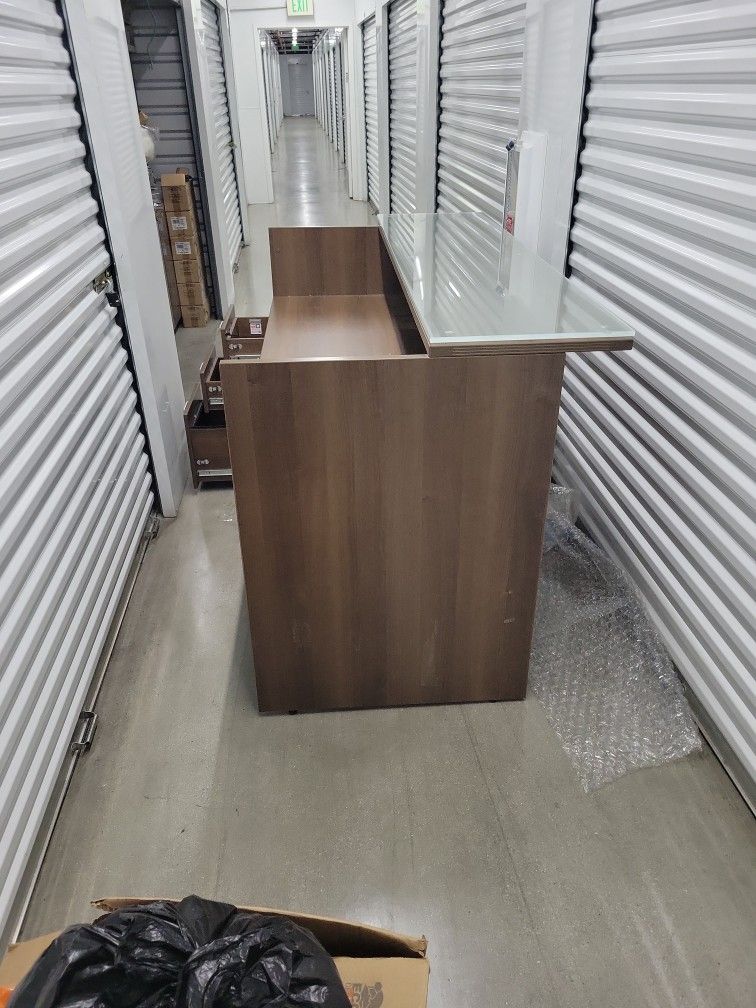 Receptionist desk in GREAT condition with glass countertop. Light brown. Drawers are all in working condition. Excellent for any small or mid-size office setting. Length 71 Width 26 height 42 Need to sell ASAP