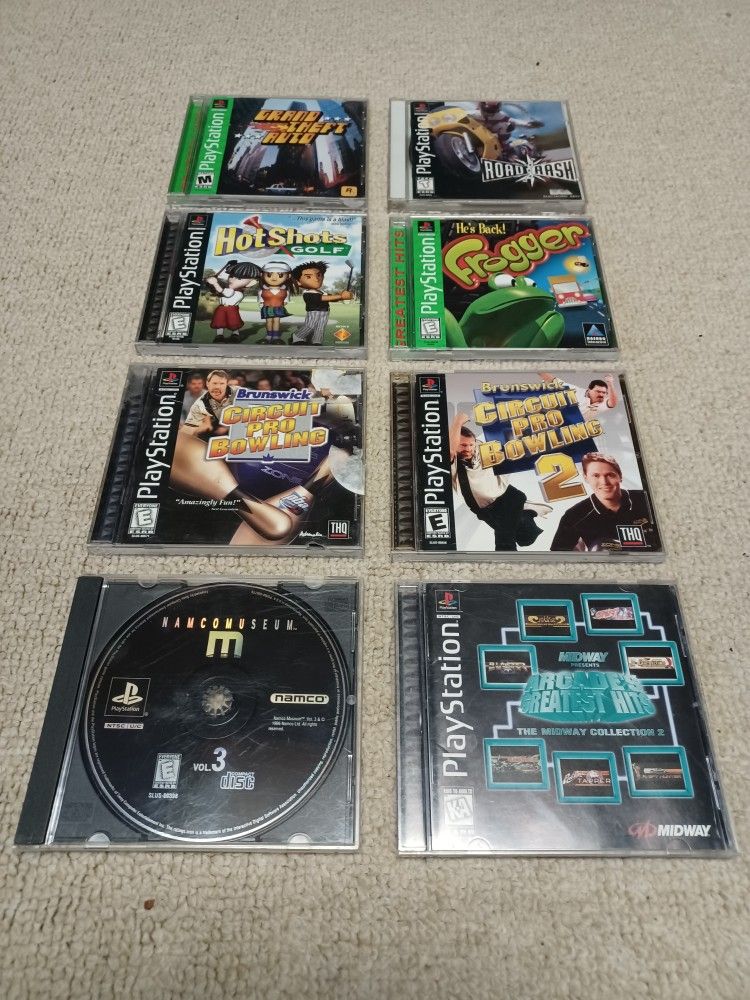 Classic Playstation 1 video games Lot of 8 games: Grand Theft Auto Hot Shots Golf Road Rash Frogger PBA pro circuit Bowling PBA pro circuit bowling 2 Nacmo Museum Collection volume 3 Midway Arcades Greatest Hits volume 2 All games include original case and instruction booklets with exception of Nacmo museum collection which is missing the instruction booklet.