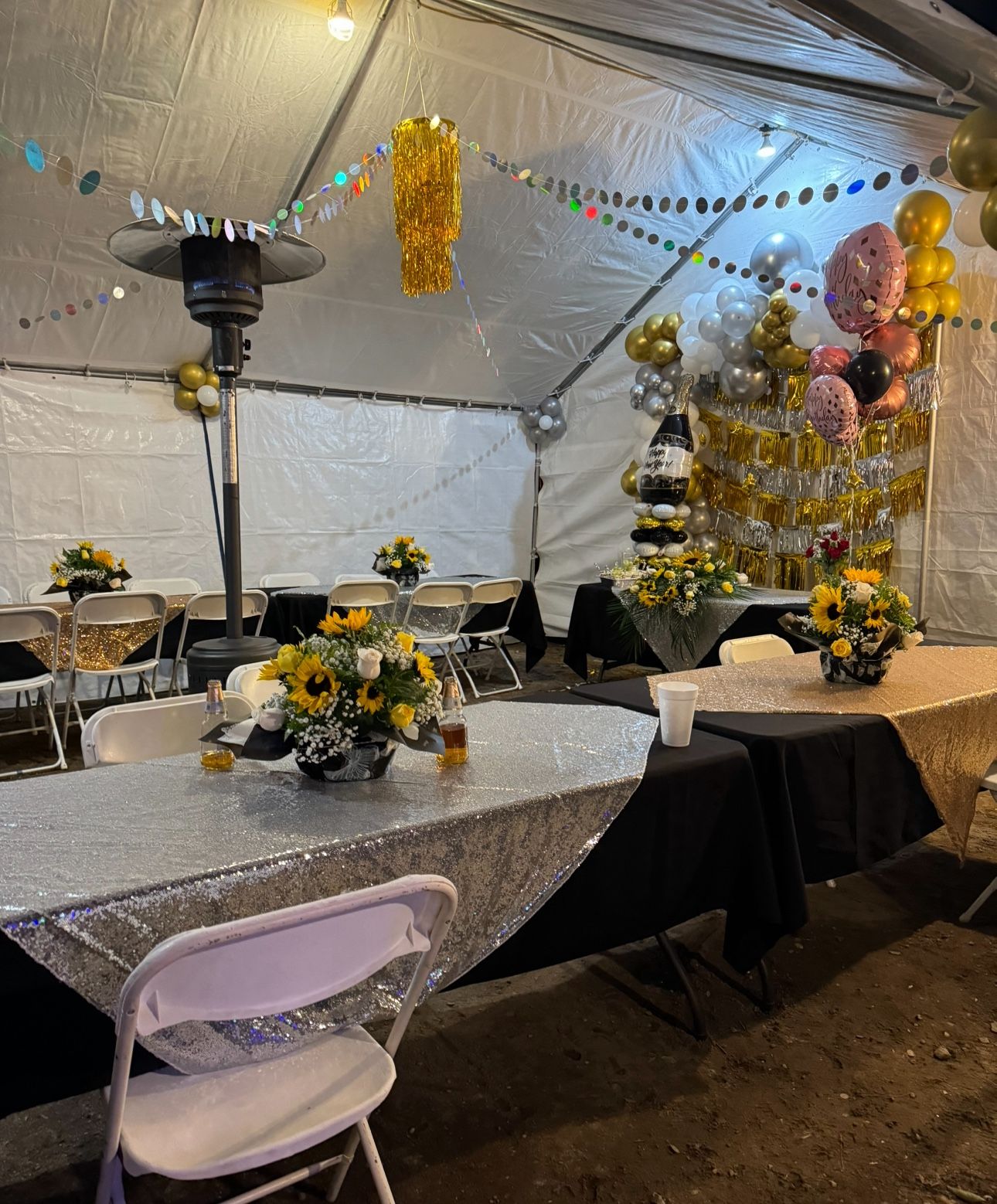 Im located in Lake Elsinore I have rectangle tables and circle tables have chairs and heaters Jumpers blue and pink Have tents 20x20, 20x30, 20x40 Take cash and or zelle Message me if you are interested and have any questions