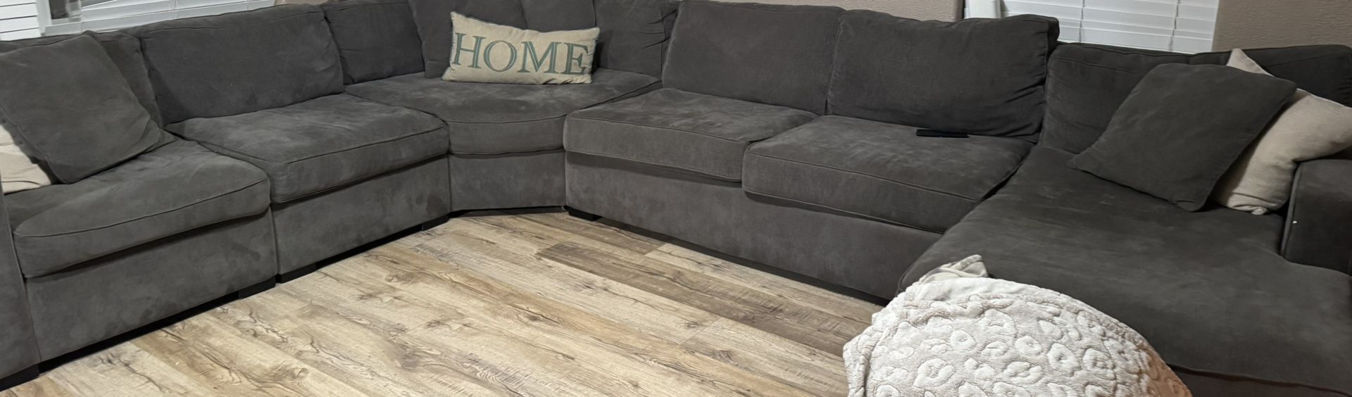 Radley 5-Piece Fabric Chaise Sectional Sofa In color mocha gray. 1 cushion has a rip and a couple stains that can be removed. $400 OBO