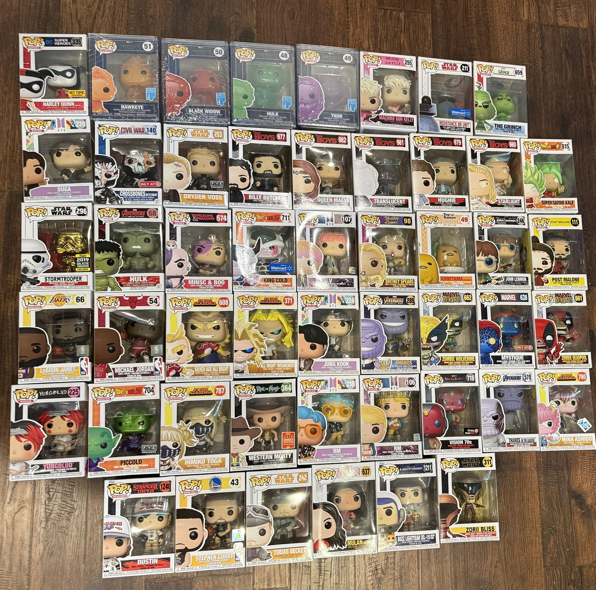 50 funko pops, all have never been opened. Some boxes have a couple dings here and there but overall the lot is in great shape. Been in storage for a few years. Most are valued from $10-15 on eBay but some outliers above that. Will take an offer for the whole lot, don’t want to piece it out.