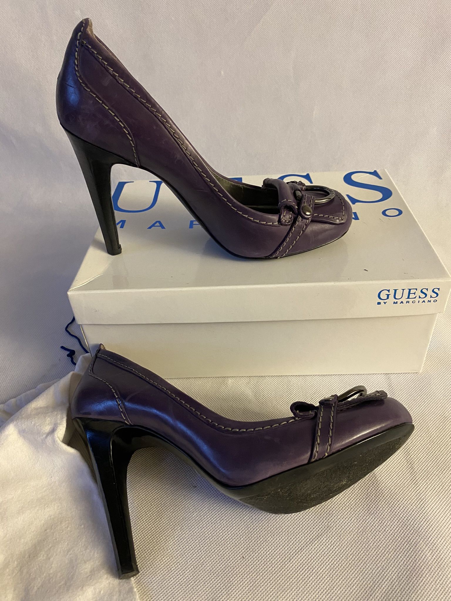 Guess logo buckle detail on front of shoe. Leather. Round toe. Bought in the Canary Islands, Spain. Fantastic condition. Worn only once to dinner European size 39 Comes in box with dust bag. Originally Purchased for $225