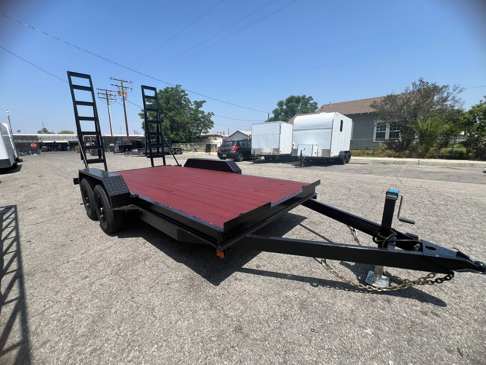 SKY TRAILERS Utility Trailer 8.5X14 Trailer Utility Enclosed CarHauler Dump TinyHome Flatbed Landscape Cargo Cars Vehicle Racing Car Carson Five Star Quality Trailer Light Weight Customized Affordable Trailer ConcessionTruck Heavy Duty Inland Empire Los Angeles Arizona $5,500 + Tax & Licensing / We Take Care of DMV Paperwork / Financing Available / 100 Miles Free Delivery / Hablo Espanol / Located In Colton 2 5/16� A-Frame Coupler Rated At 14,000lb 3'6"� Channel Tongue Wrapped On Frame 2 Detachable Chains Rated @5,000lb Each 7,000lb Weight Capacity Top Wind Jack 7 Way Round RV Plug Emergency Break Way Kit 2X6 Water Resistant Red Wood Stain Floor 1-5200lb Dexter Double Eye Leaf Spring Idler Axle 1-5200lb Dexter Double Eye Leaf Spring Electric Brake Axle 6ft Equipment Style Ramps 6 D-rings Diamond Plate Fenders Fender Steps 4-225/75/15 Wheels 4 Exterior Marker Lights 2 Exterior 4" Square Taillights 6'11� Inside The Fenders 8�5� Fender To Fender 18� 8� Overall Length Ground Clearance 17� Trailer Weight 1650 Lbs 7,000lb GVWR Warranty: Personal use: 2 Year warranty on welds 6 Year warranty on axles through DEXTER Commercial use: 6-month warranty. FREE DELIVERY 100 MILES! $2 A MILE AFTER THE FIRST 100 Give us a call at 909-381-0005