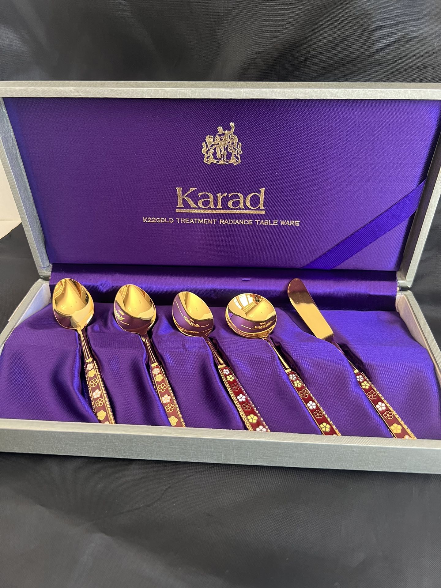 K22 gold plated cloisonné Karad butter knife, sugar spoon and 3 teaspoons. See pictures for sizing. Never used, only removed from plastic for photos. *Box included