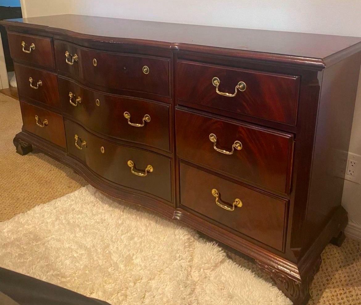They don’t make them like this anymore unless ur’s $$$$$. Thomasville Solid wood flame mahogany 9-drawer dresser with dovetailed drawers and intricately-carved feet. 33.5h x 18.5d x 76w Gorgeous piece! Tons of storage. Pic of area with nick/scratch from movers. Have a matching trifold mirror that I will be selling too (currently in storage). Was several thousand new. Priced to sell due to move/downsizing. Missing a couple handles. I have some of the hardware and other can be ordered from Thomasville or replace with whatever ones you prefer.