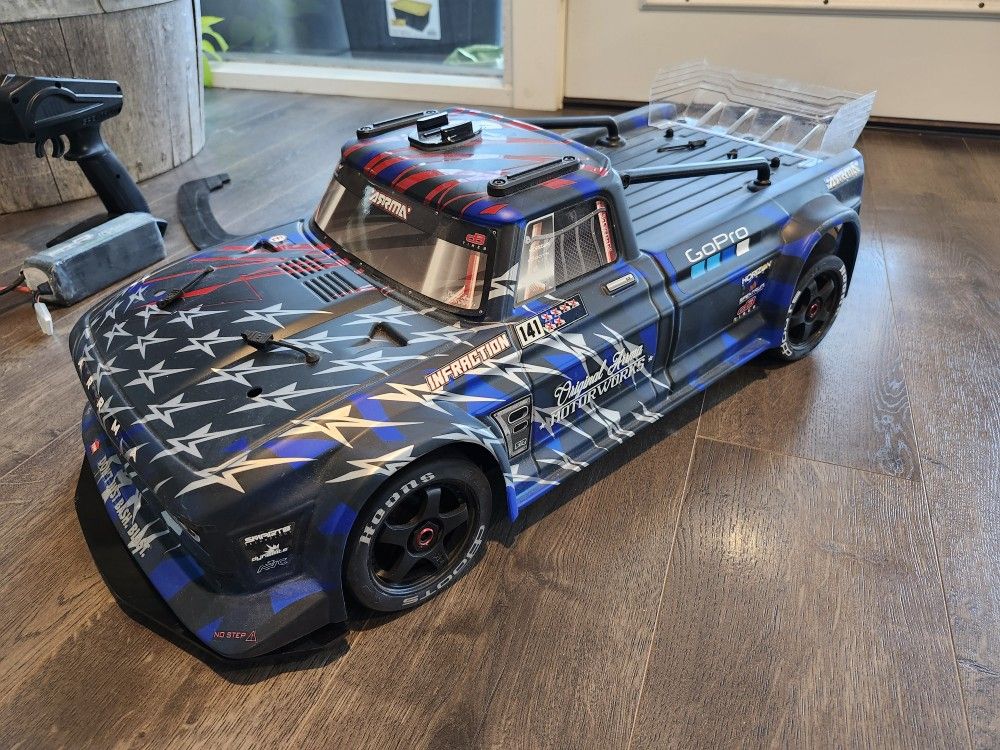 Arrma Infraction V2 6S BLX Brushless 1/7 RTR Electric 4WD Street Bash Truck (Blue) w/DX3 2.4GHz Radio, Smart ESC & AVC * Factory original blue truck body is flawless. * Pro-line Racing Protoform Nissan Skyline GT-R R34 Blue ($100 value) NEW comes with wing and front lip * 6S Lipo Ovonic 4500 50C mah Battery Included * No modifications. It does have a little gopro attachment on the top of the stock body. Great condition, used a few times. No issues or concerns. Never crashed or flipped. Price: $500 firm BREAKDOWN OF OVERALL COST: Retail: $650 for the infraction + Nissan R34 body $100 + 6s Battery +$50 Total: $900