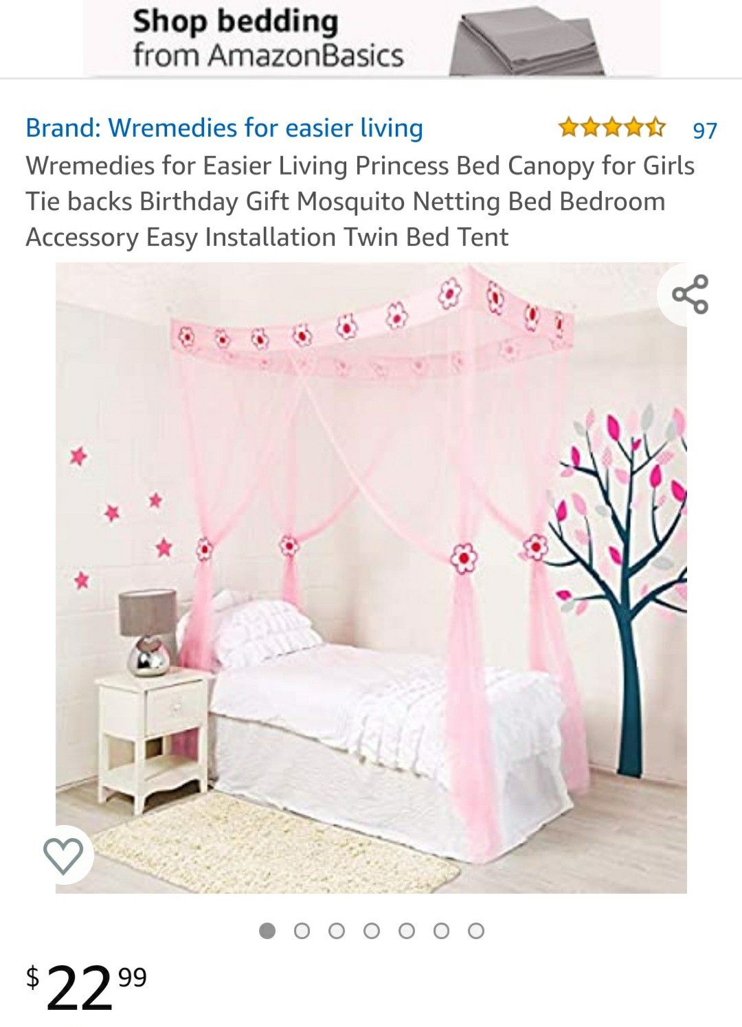 New!! Beautiful pink 4 corner canopy, you can attach it to the ceiling wall without having to put wood canopy. New never used it didn't fit the size of my daughter's bed. It's for a twin size bed bed and my daughter's bed is queen.