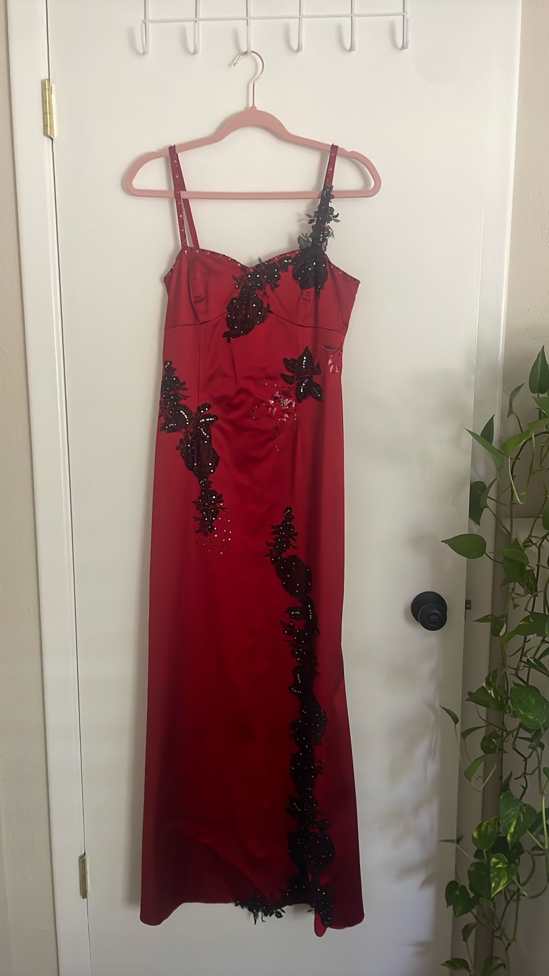 Adrianna Papell formal dress gown, suitable for events like galas, proms, or black-tie weddings. It features a floor-length design, enhancing its formal appearance. The dress is red and adorned with black lace appliques and sequins, adding a touch of elegance and sophistication. The style is not a cocktail dress, which would be shorter, but a full-length gown. It is like new, in excellent condition.