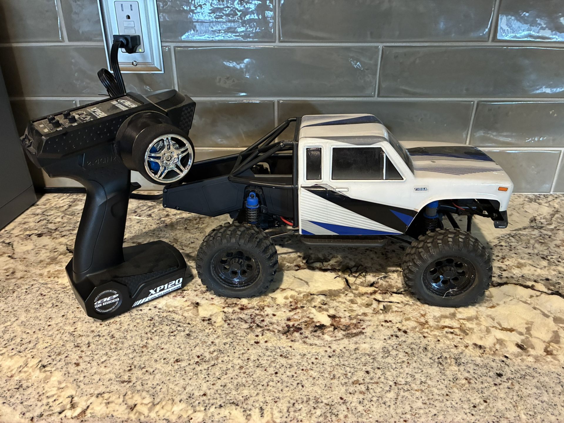 It is a 1/12 scale, 4-wheel drive (4WD) rock crawler. The specific model is easy to identify because the name "TIOGA" is printed on the side of the cab, and it features the distinctive white, blue, and black livery. Key Features of this Model: • Chassis: It uses the CR12 ladder-frame chassis, which is designed for "scale" crawling (mimicking real-world off-road trucks). • Radio System: The transmitter sitting next to it is the XP120 2.4GHz radio, which originally came included in the Ready-To-Run (RTR) package. • Body Style: This version features a molded rear roll cage and a hinged body for easy access to the battery and electronics. • Wheels/Tires: It has 1.9-inch scale wheels with soft compound tires, which are great for gripping rocks and obstacles. It’s a solid little rig for trail running and light crawling. Are you looking to find spare parts