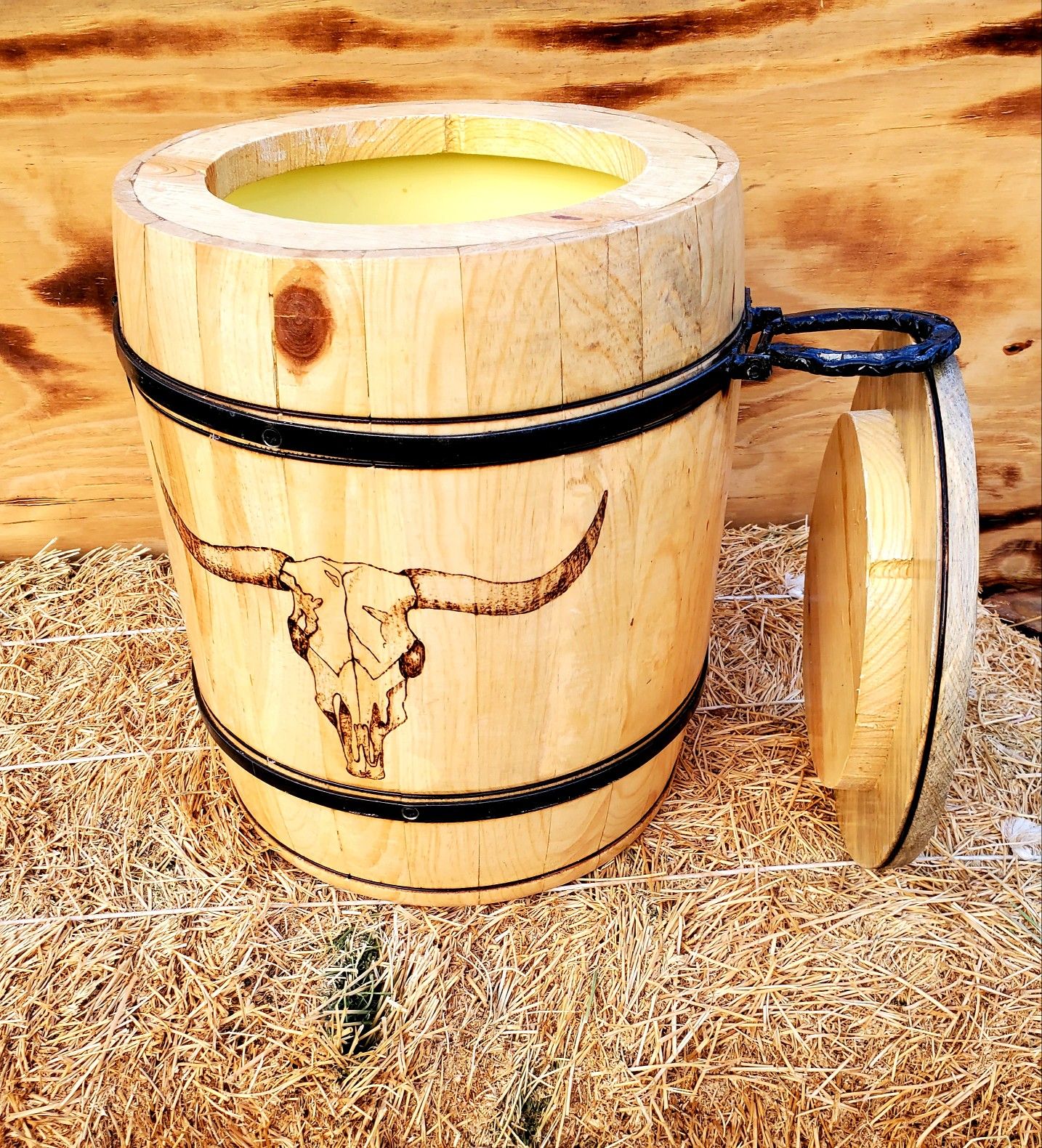 🧊🧊This beautiful Ice Chest was handcrafted using REAL pine wood. It has two horseshoe handles that give this piece a very unique rustic look. Itcomes with a lid for your convenience. It is a 20 Qt capacity, Height 16.5 inches, Diameter 13 inches. 📍Please ask for a custom made design😍 Hielera hecha a mano de madera 100% de pino. Barnizada para darle una apariencia unica. Capasidad de 5 gallones para mantener las bebidas frias en este verano🧊🥤🍺🍎 📍No olvide preguntar por la opcion de diseño exclusivo!🤩
