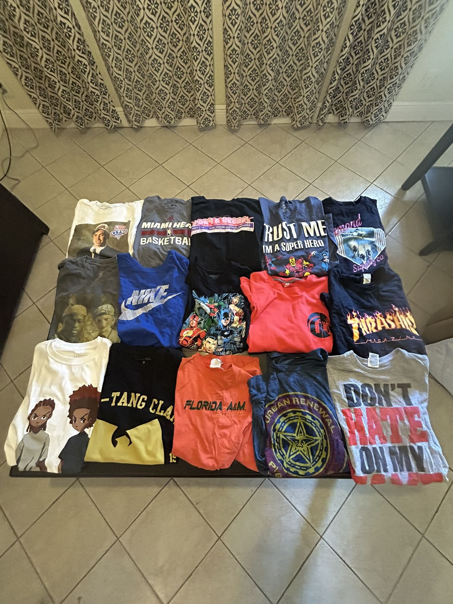Steve Nash shirt- M 10$ White men can’t jump- L 5$ The boondocks- M 10$ Miami Heat- XL 5$ Nike tee-L 5$ Wu tang clan- L 5$ Vegas Longsleeve- L 30$ Justice Leauge- L 5$ FAMU- XL 5$ Diamond supply co-L 5$ thrasher long sleeve- L 10$ Don’t hate on my game-M 5$ Trust me I’m a superhero marvel- L 5$ Nike red tee-L 10$ urban renewal- L 5$ Pierre shirt- L 10$ I don’t give shirt- L 5$ Miami Heat shorts- M 5$ Pink Floyd- 2X 5$ Goal getter shirt- XL 5$ KD shorts-S 5$ NEF CO- XL 5$ NASA- XL 5$ BVB jersey- XL 5$ Milwaukee bucks jersey- XL 5$ Nike Washington wizards tee- L 10$ Post game 8 ball tee-XL 10$ Umbro jersey/Tee- M 5$ Polo white-M 10$ Polo blue-M 10$ Ice cube- M 5$ Purple Reign- M 5$ The exorcist- M 5$ Kiss- M 5$ Michael Myers- M 5$ Nike long sleeve- S 20$ Kappa- L 15$ Nike red- L 20$ Jordan long sleeve - M (both) 15$ Odd future- L 20$ Jerseys Harden-L 5$ Dolphins- M 25$ Zoo York- L 14/16 5$ Falcons-XL 10$ BIBBY- L 14-16 5$ Lillard-XL 15$ Lebron- XL 25$
