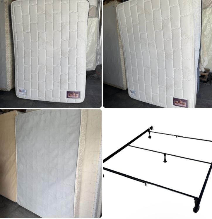 3 pc: beige color Angel Touch pillow top full size mattress $95, metal bed frame $45, box spring $45 or $-85 for set. Excellent condition will deliver for an additional $45 based on 10 mile radius.