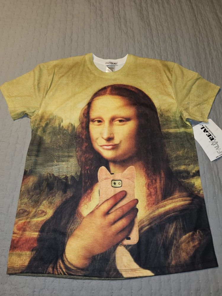 $10.00 each ×× cash only ×× *xposted*fcfs*firm*NEW* Faux+Real Men's Mona Lisa Smile shirt - print shows Mona Lisa holding a cell phone - men's size Medium - men's size XLarge