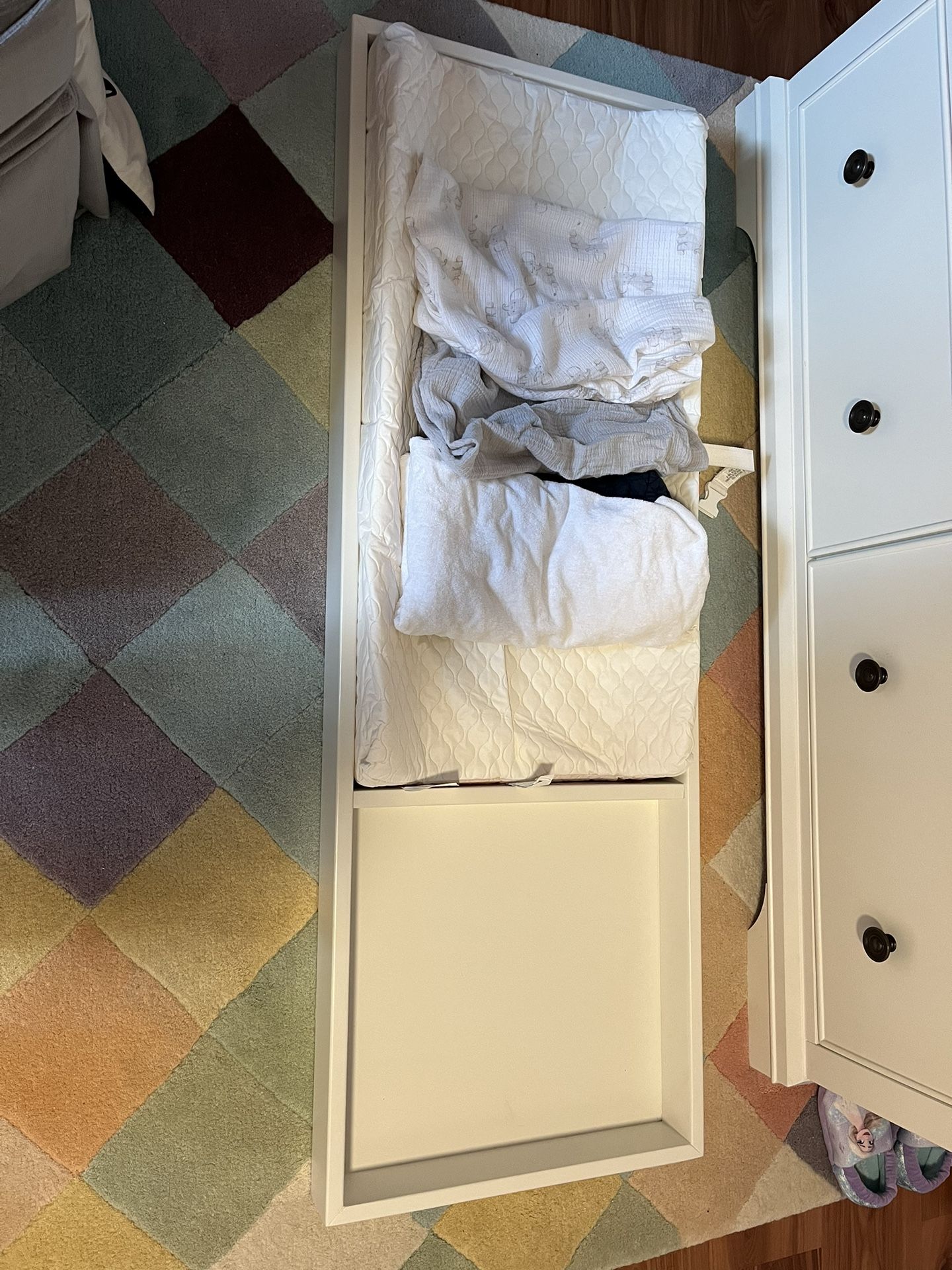 Pottery Barn Kids Larkin nursery topper for extra wide dresser. Comes with matching changing pad (with belt) and x3 fitted sheets. In great condition, used for 1 kiddo. Comes with brackets and screws. This is $200+ new, get it here for $85. 98146 near shorewood elementary. Thanks (dresser in pic is not included)