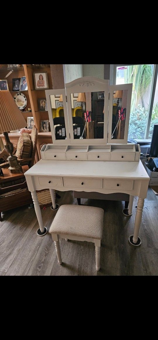 White make up vanity. Mirror on right side was damaged on upper corner. Due to that, selling at a very low price.
