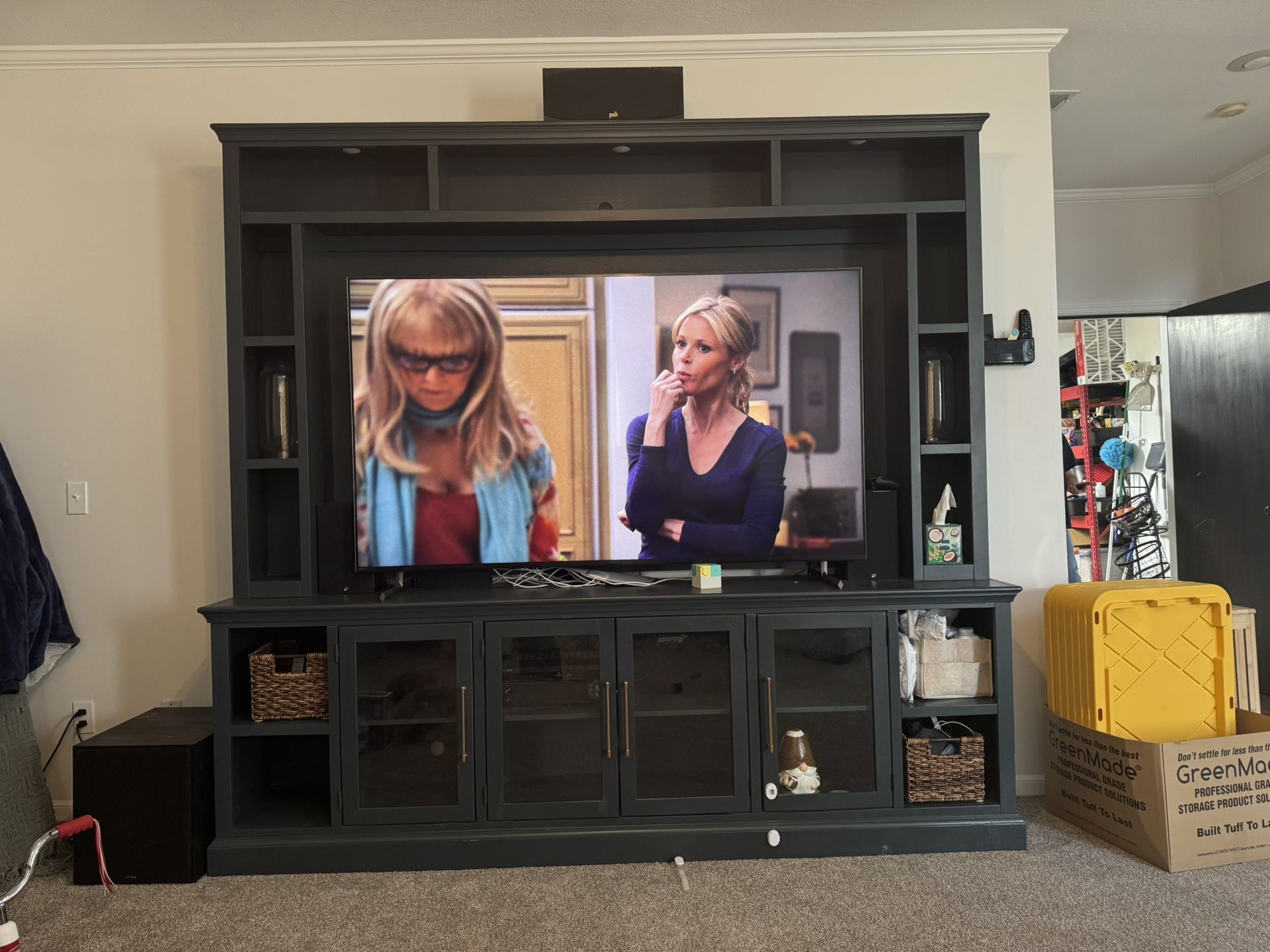 Moving sale! Total size 91.5”h x 98”w x 17.5”d 3 cabinets with plenty of open storage for pictures/decorations. Easily fits 70” TV Cut outs for easy wiring. The top separates from bottom half for easier moving You must pick up, no deliveries. I can help separate the stand, but you’re responsible for loading. Firm on price.