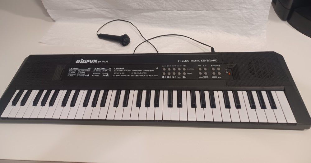 BIGFUN BF-6138 62 keys electronic portable keyboard approx size 24.4" L x 6.3" D x 1.8" H has 5 rhythms, 5 instrument effects, and 6 demo songs with a mini microphone offer a wide range of long service time Support indoor & Outdoor Powered through USB connect or 3 AAA batteries not included **Cash only and pick up ** Check out my other listings **