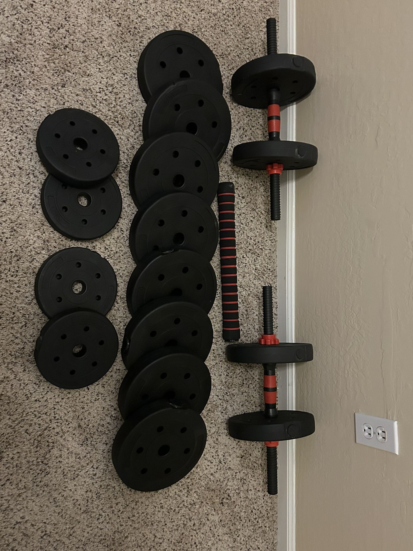 Adjustable Dumbbells Weights Set Barbell:88 lbs Barbell 3-in-1 Quick Conversion with Nonslip Ergonomic Connecting Rod. Rarely used. OBO 4- 1.25 kg plates 4 - 2.5 kg plates 8 - 3 kg plates