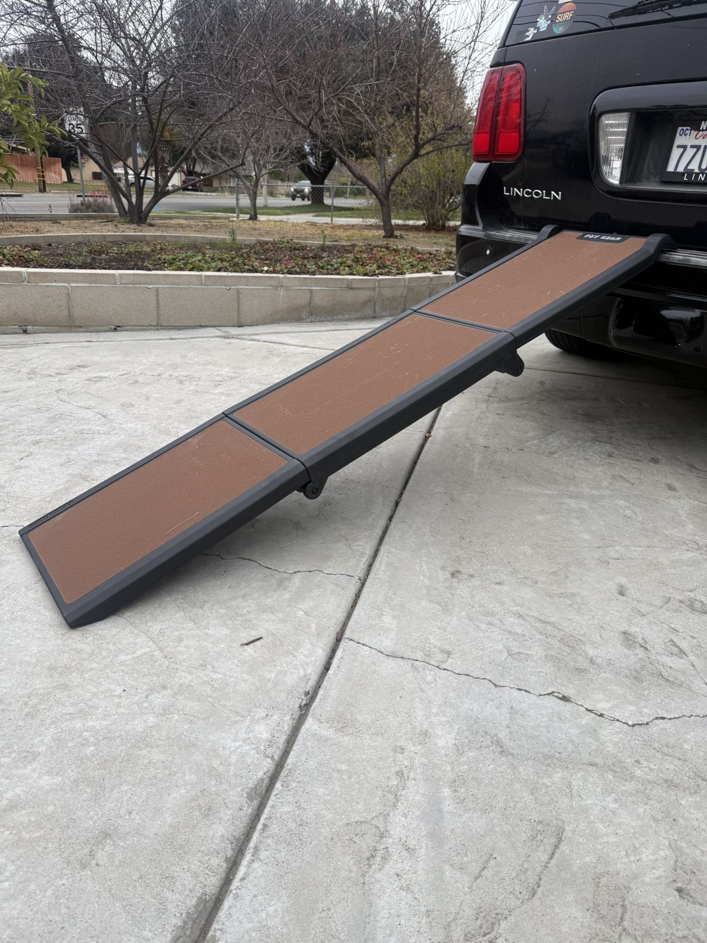 Pet Gear Tri-Fold Dog Ramp (70”) – Like New – Holds Up to 200 lbs Price: $70 OBO Description: Pet Gear Full Length Tri-Fold Pet Ramp in Grey/Black. 70 inches long. Used once — my senior dog wouldn’t walk up it, so it’s basically been sitting in the box ever since. It’s in almost perfect, like-new condition. Originally $135+ (currently $114.99 on Chewy). Details: • 70” long x 19.5” wide • Holds pets up to 200 lbs • Slip-resistant textured surface • Rubber grippers on bottom to keep ramp steady • Tri-fold design for compact storage • Carry handle for easy transport Perfect for SUVs, trucks, or higher vehicles. Great for senior dogs, large breeds, or dogs recovering from injury. Comes with original box. Pickup only in Redlands CA. Cash, Venmo or Zelle