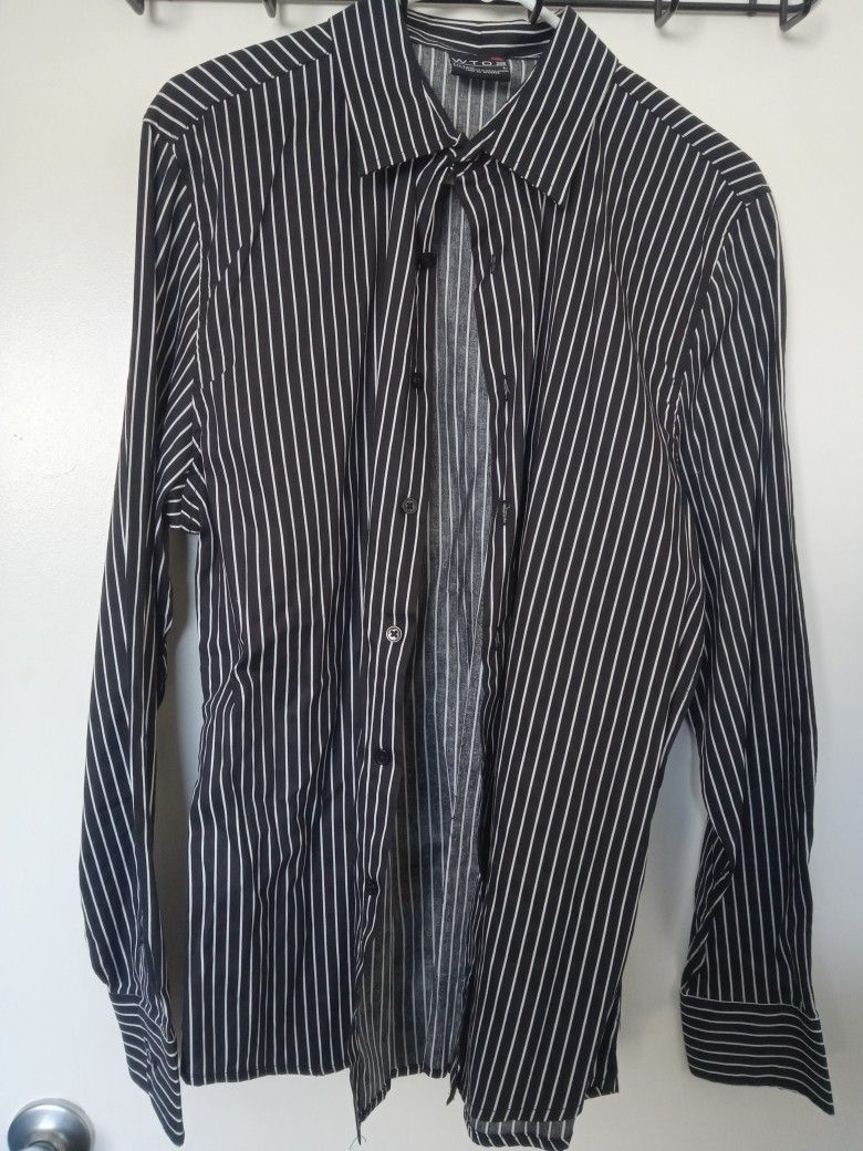 New large WTO2 black white stripped button up dress shirt. Asking $10