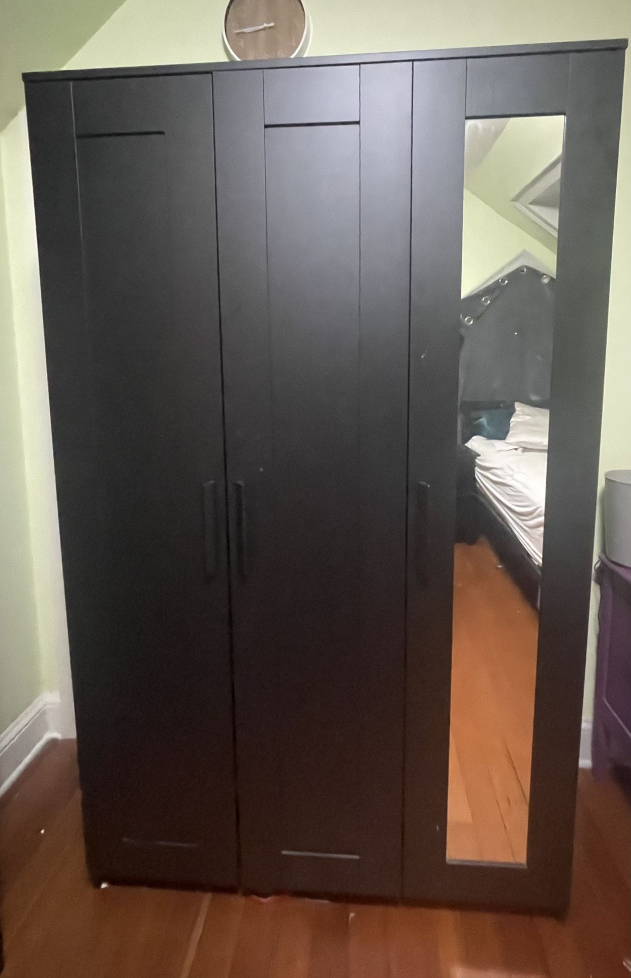 Great condition wardrobe with built in shelves and bar. A full length mirror to sufficiently see your outfits, and a cute cozy look that fits in any bedroom. Must pickup and disassemble, priced to reflect.