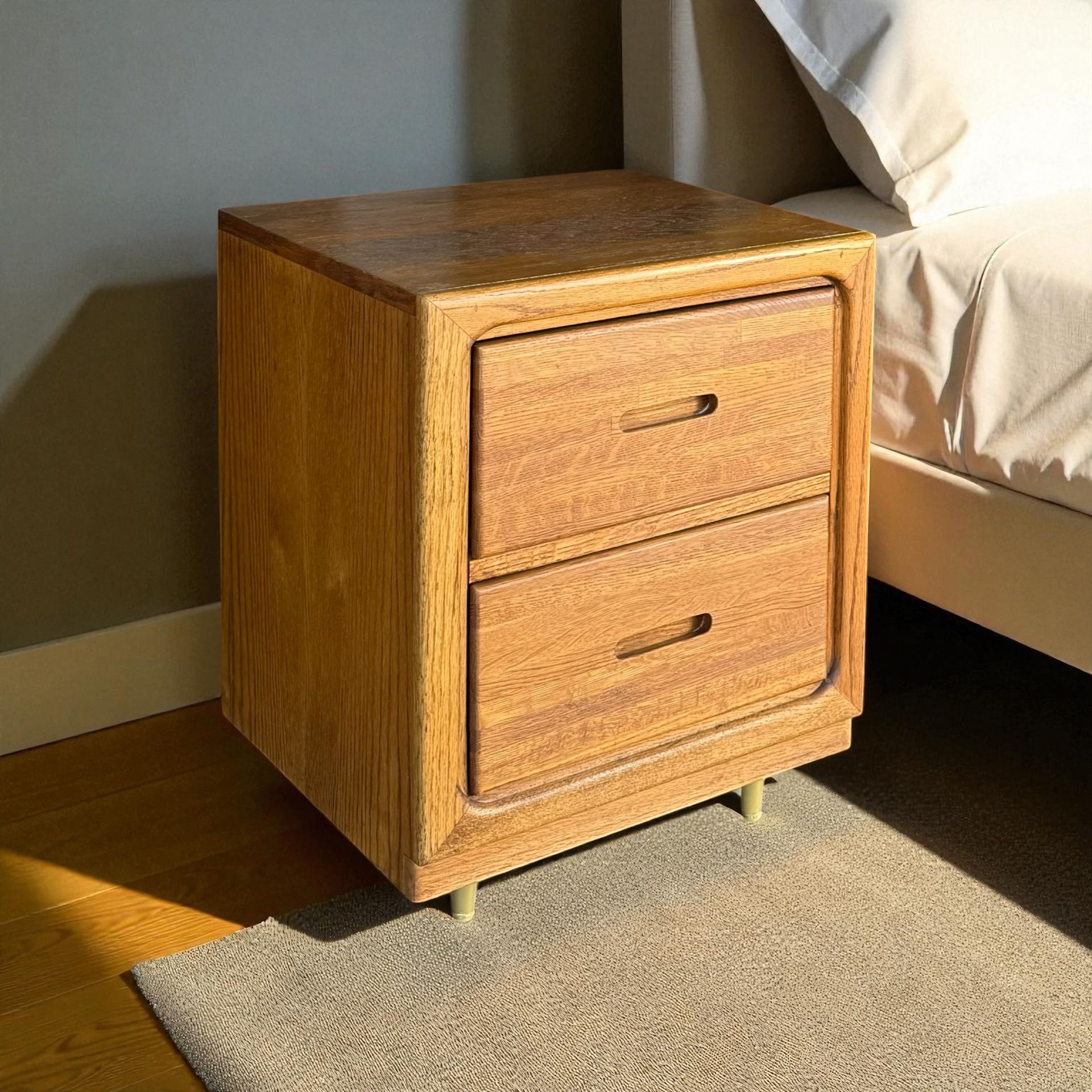 18” W × 18” D × 23” H Upgrade your space with this solid oak nightstand featuring clean mid-century lines, inset drawer pulls, and smooth-gliding drawers. ✔ Solid oak construction ✔ Two spacious drawers ✔ Modern brass legs ✔ Sturdy and in great condition Perfect for bedrooms, guest rooms, or as a stylish side table. Pickup in Lakeside — $50