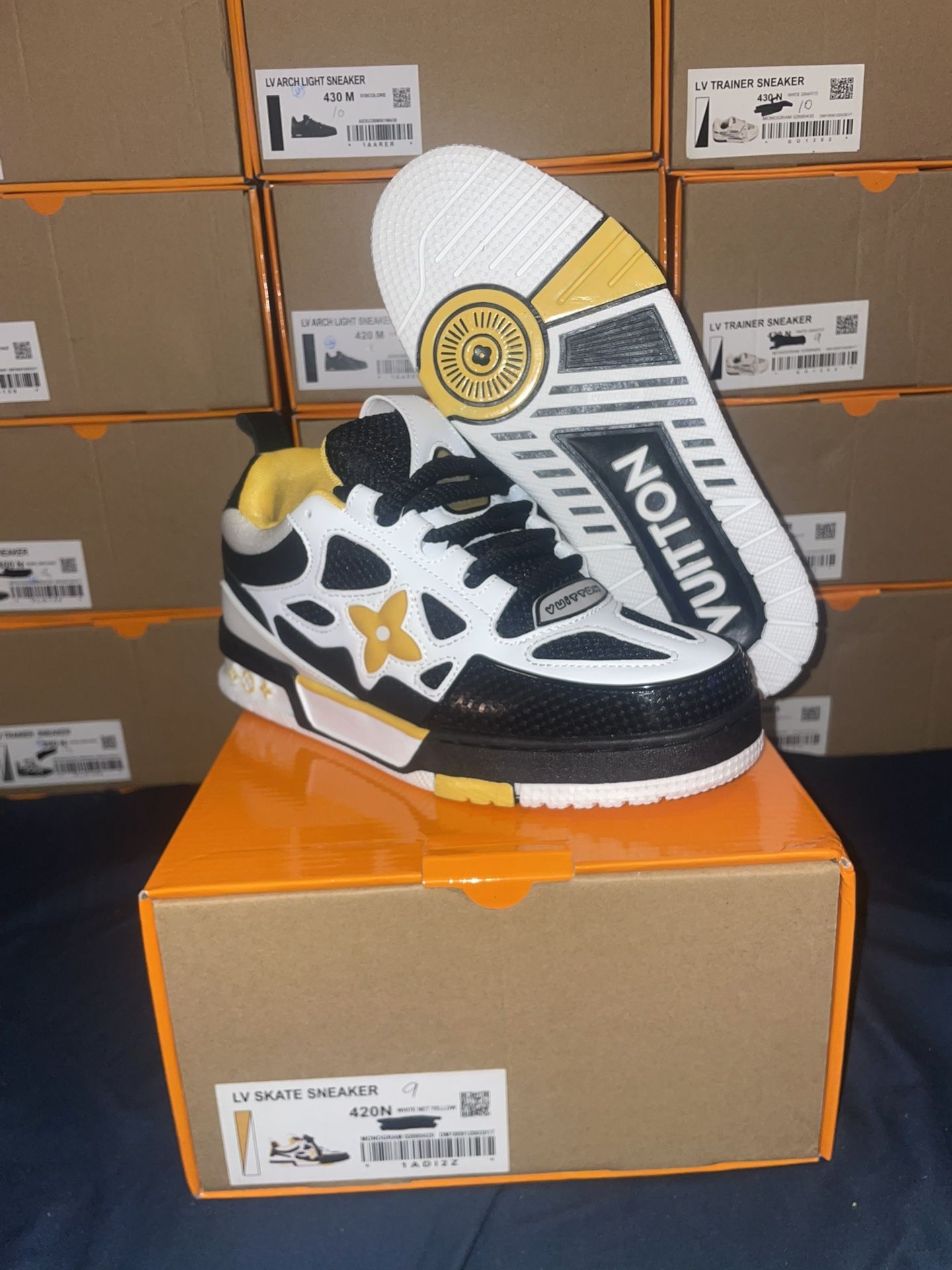 This is a Louis Vuitton LV Skate Sneaker in the Marine White black & yellow colorway, made from technical mesh, calf leather, and suede.