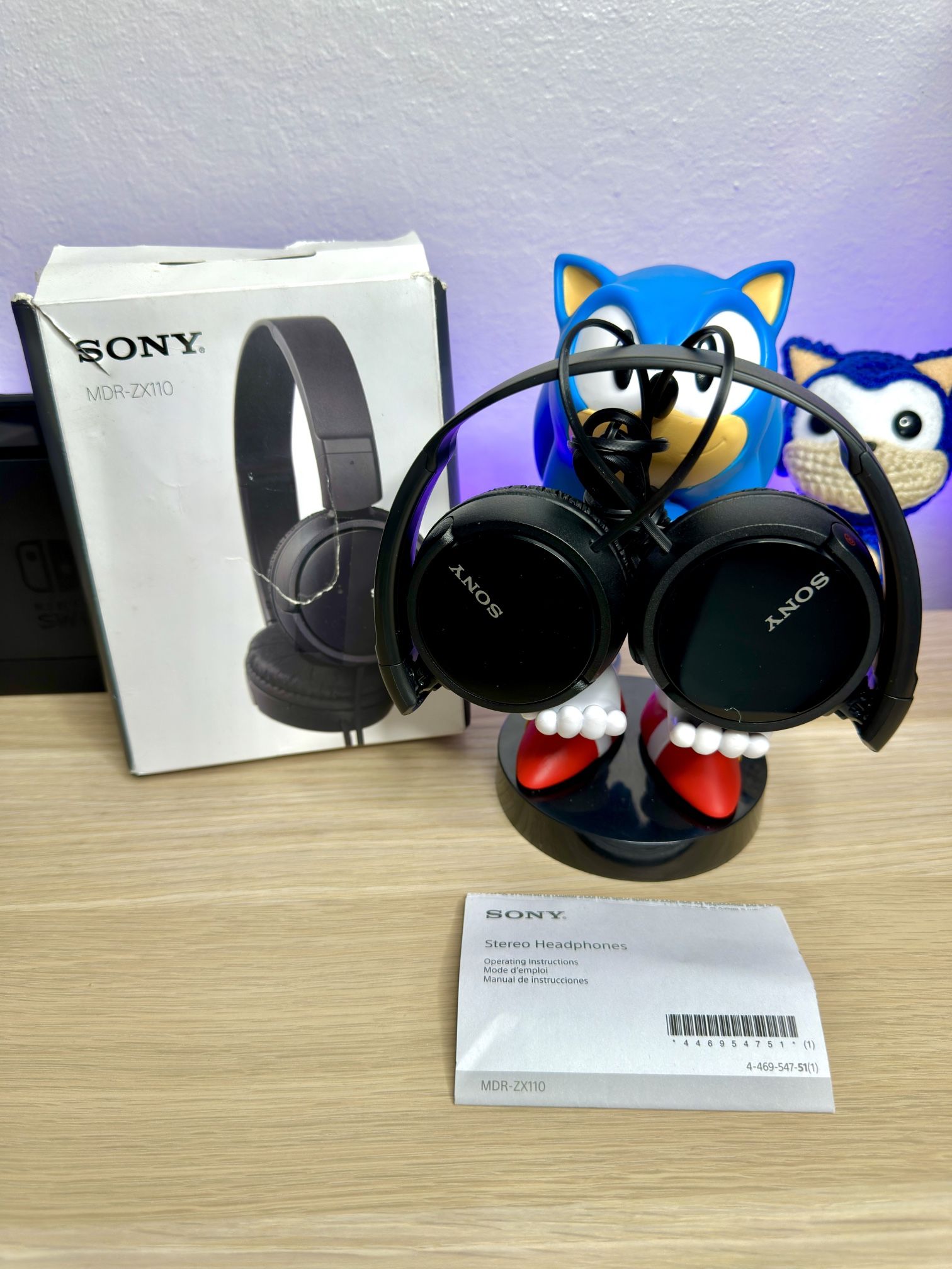Up for sale is a pair of Sony MDR-ZX110 on ear headphones. These are known for their lightweight design and clear, powerful sound. This listing includes the full kit: headphones, original box, and all paperwork. However, please note the photos regarding the box condition. The box is old, shelf worn, and has some crushing/dents from storage. It has seen better days, but it did its job protecting the headphones inside. The headphones themselves are in good, fully functional condition. They have been tested and work perfectly. Includes: · Sony MDR-ZX110 Headphones · Original Box (Damaged - see photos) · Original Documentation A great pair of backup headphones or a budget friendly buy. Photos show the exact item you will receive.