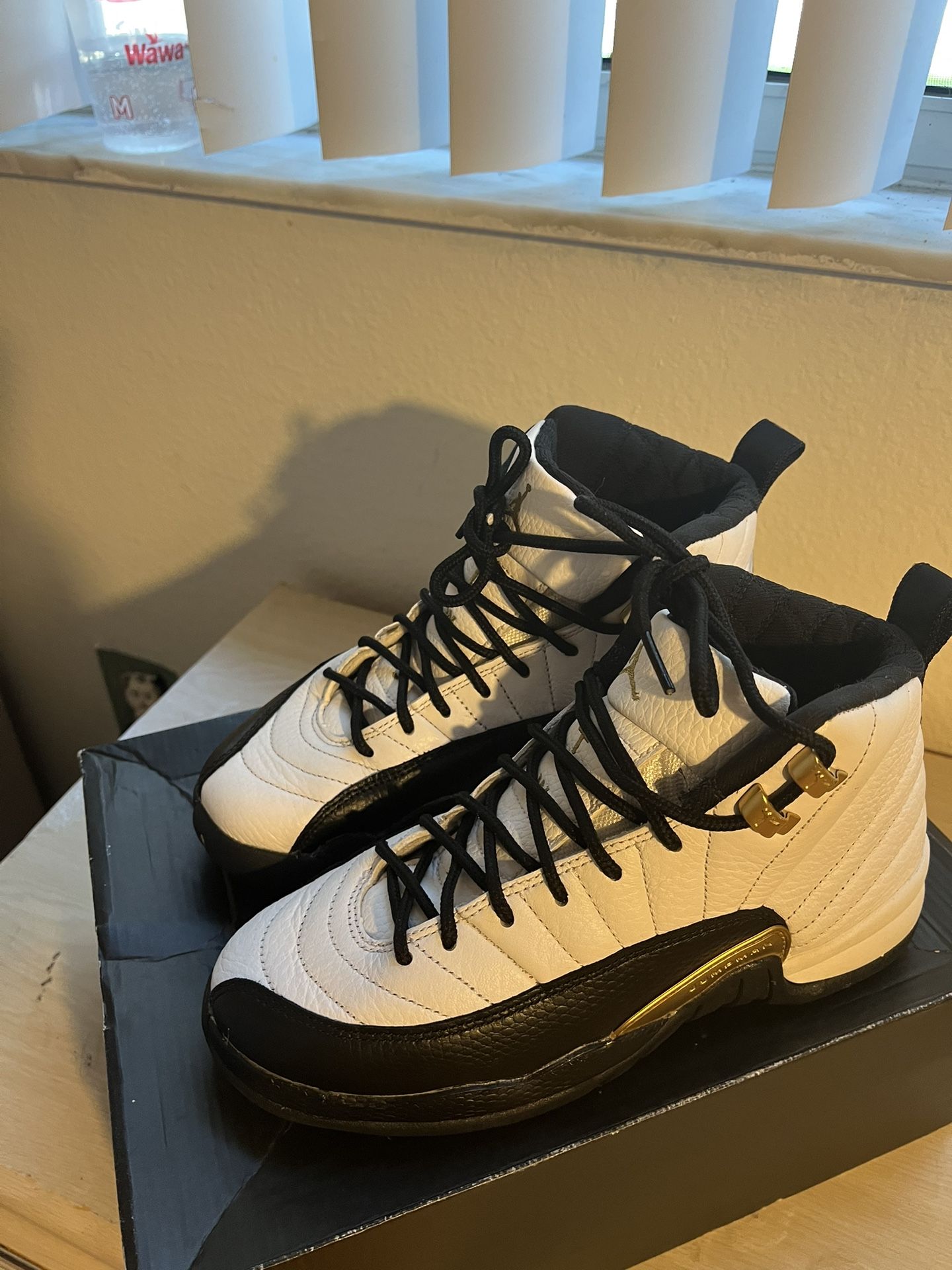 Jordan 12 “Royal Taxi” Size: [4y] Condition: Great shape Selling my pair of Jordan 12 Royal Taxis. Super clean — just lightly worn, no major creases or scuffs. White and black leather with gold details. Comes with the box (box has a little wear). Really nice pair, just don’t wear them much anymore. Price: $60 — open to offers.
