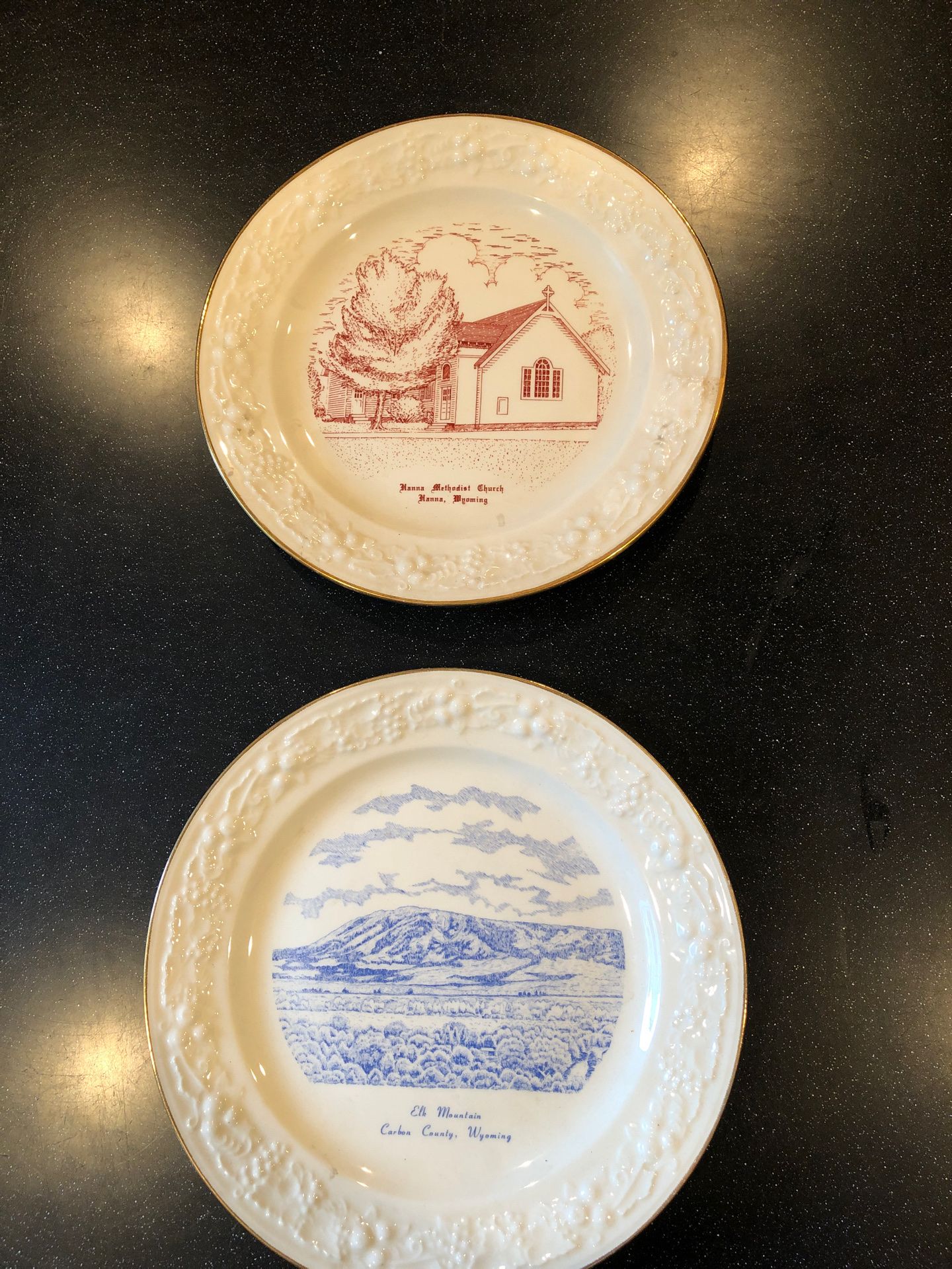 Beautiful condition set of 2 collector plates depicting Wyoming landmarks—Hanna Methodist Church and Elk Mountain. Historical information printed on back of each plate.