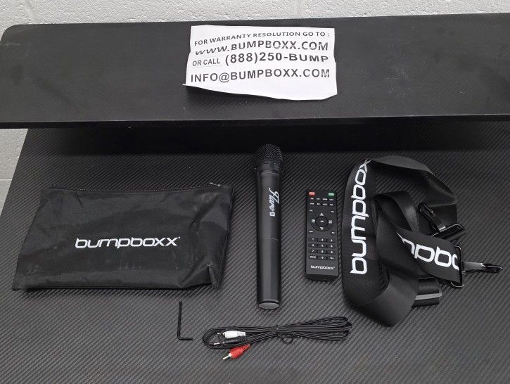 Bump Box Karaoke Microphone. Brand new, includes microphone, wire, remote, carry strap, and accessory bag. All you need is a speaker and you'll be ready to go. Sold as seen