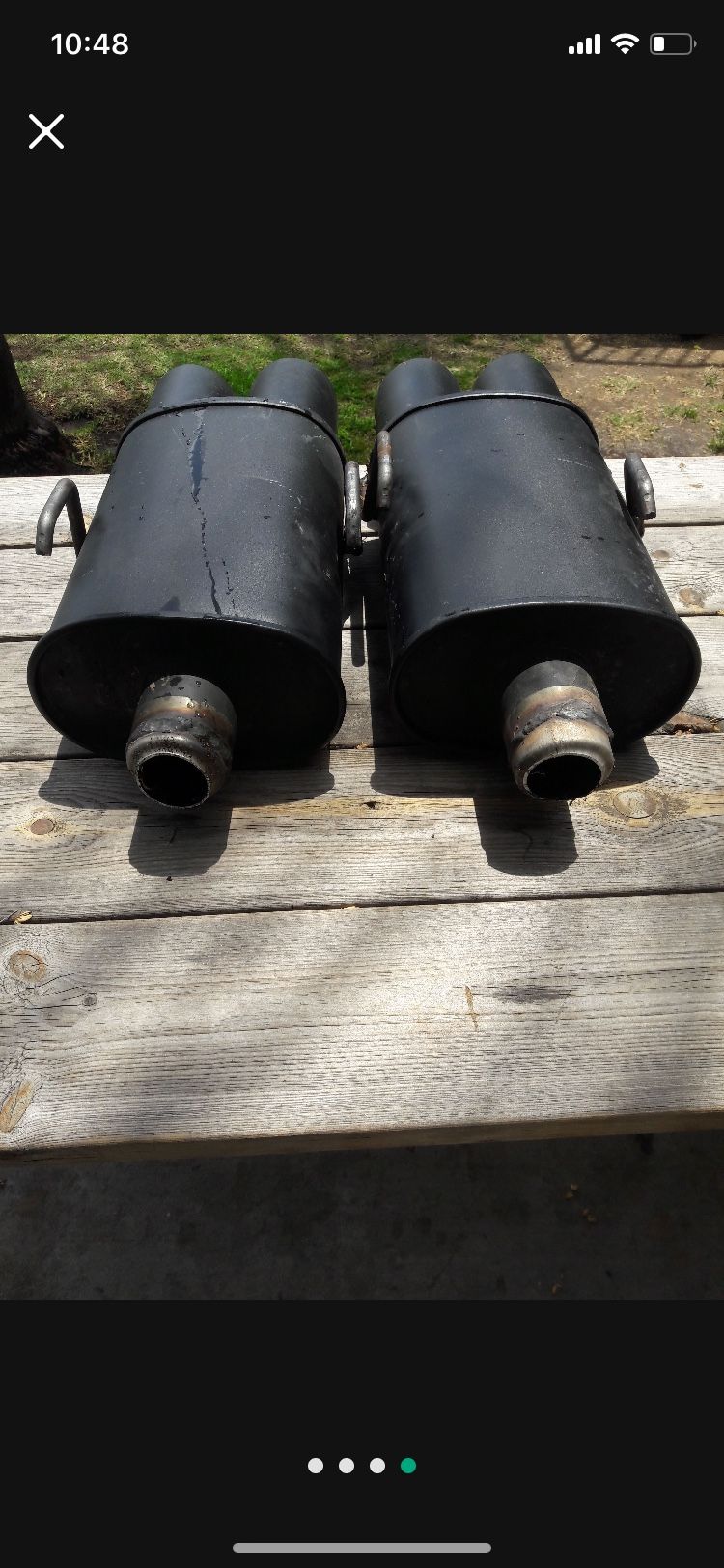 Two double wall exhaust muffler they do have a really deep moffler sound for those who like deep sound muffler in great condition obo